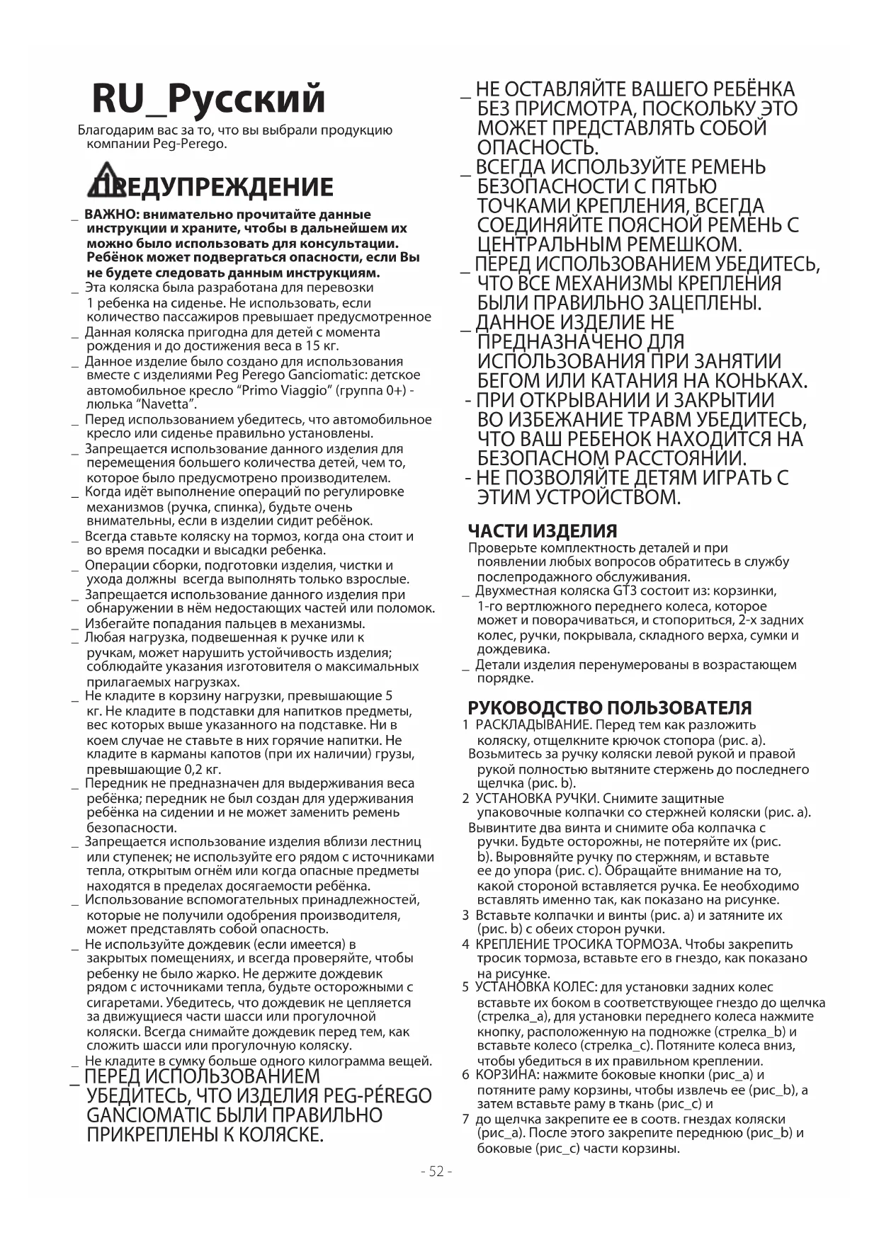 Če izgubite ali poškodujete sestavni del izdelka, uporabite izključno originalne rezervne dele Peg Pérego. V primeru popravil, zamenjav, podatkov o izdelku in naročila originalnih nadomestnih delov in dodatkov, se obrnite na službo za pomoč uporabnikom Peg Perego, pri tem pa navedite serijsko številko izdelka, če je le ta navedena. tel. 0039/039/6088213 faks 0039/039/3309992 e-pošta assistenza@pegperego.it spletna stran www.pegperego.com- 52 - RU_Pусский Благодарим вас за то, что вы выбрали продукцию компании Peg-Pеrego. ПРЕДУПРЕЖДЕНИЕ _ ВАЖНО: внимательно прочитайте данные инструкции и храните, чтобы в дальнейшем их можно было использовать для консультации. Ребёнок может подвергаться опасности, если Вы не будете следовать данным инструкциям. _ Эта коляска была разработана для перевозки 1 ребенка на сиденье. Не использовать, если количество пассажиров превышает предусмотренное _ Данная коляска пригодна для детей с момента рождения и до достижения веса в 15 кг. _ Данное изделие было создано для использования вместе с изделиями Peg Perego Ganciomatic: детское автомобильное кресло “Primo Viaggio” (группа 0+) - люлька “Navetta”. _ Перед использованием убедитесь, что автомобильное кресло или сиденье правильно установлены. _ Запрещается использование данного изделия для перемещения большего количества детей, чем то, которое было предусмотрено производителем. _ Когда идёт выполнение операций по регулировке механизмов (ручка, спинка), будьте очень внимательны, если в изделии сидит ребёнок. _ Всегда ставьте коляску на тормоз, когда она стоит и во время посадки и высадки ребенка. _ Операции сборки, подготовки изделия, чистки и ухода должны всегда выполнять только взрослые. _ Запрещается использование данного изделия при обнаружении в нём недостающих частей или поломок. _ Избегайте попадания пальцев в механизмы. _ Любая нагрузка, подвешенная к ручке или к ручкам, может нарушить устойчивость изделия; соблюдайте указания изготовителя о максимальных прилагаемых нагрузках. _ Не кладите в корзину нагрузки, превышающие 5 кг. Не кладите в подставки для напитков предметы, вес которых выше указанного на подставке. Ни в коем случае не ставьте в них горячие напитки. Не кладите в карманы капотов (при их наличии) грузы, превышающие 0,2 кг. _ Передник не предназначен для выдерживания веса ребёнка; передник не был создан для удерживания ребёнка на сидении и не может заменить ремень безопасности. _ Запрещается использование изделия вблизи лестниц или ступенек; не используйте его рядом с источниками тепла, открытым огнём или когда опасные предметы находятся в пределах досягаемости ребёнка. _ Использование вспомогательных принадлежностей, которые не получили одобрения производителя, может представлять собой опасность. _ Не используйте дождевик (если имеется) в закрытых помещениях, и всегда проверяйте, чтобы ребенку не было жарко. Не держите дождевик рядом с источниками тепла, будьте осторожными с сигаретами. Убедитесь, что дождевик не цепляется за движущиеся части шасси или прогулочной коляски. Всегда снимайте дождевик перед тем, как сложить шасси или прогулочную коляску. _ Не кладите в сумку больше одного килограмма вещей. _ ПЕРЕД ИСПОЛЬЗОВАНИЕМ УБЕДИТЕСЬ, ЧТО ИЗДЕЛИЯ PEG-PÉREGO GANCIOMATIC БЫЛИ ПРАВИЛЬНО ПРИКРЕПЛЕНЫ К КОЛЯСКЕ. _ НЕ ОСТАВЛЯЙТЕ ВАШЕГО РЕБЁНКА БЕЗ ПРИСМОТРА, ПОСКОЛЬКУ ЭТО МОЖЕТ ПРЕДСТАВЛЯТЬ СОБОЙ