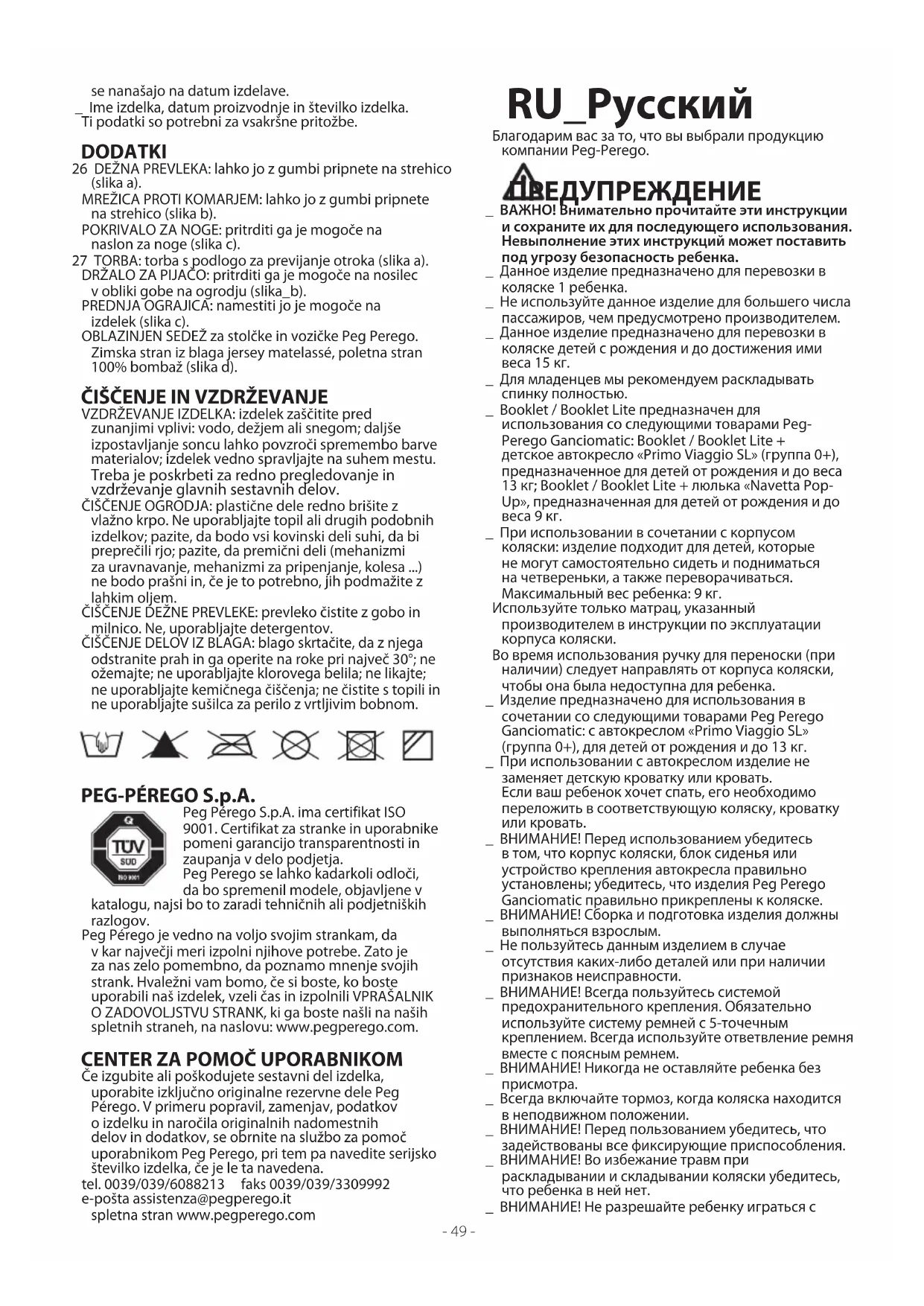 Mekanizmaların içine parmaklarınızı sokmaktan kaçınınız. _ Mekanizmaların (bağlantı çubuğu, arkalık) ayarlama işlemleri gerçekleştirildiği zaman, bebeğin mevcudiyetine dikkat ediniz. _ Bağlantı çubuğuna veya kollara asılan her yük, ürünün dengesini bozabilir; kullanılabilir azami yüklere ilişkin üretici firmanın talimatlarını takip ediniz. _ Ön bariyer, bebeğin ağırlığı taşımak üzere tasarlanmamıştır; ön bariyer, bebeği oturma yerinde tutmak üzere dizayn edilmemiştir ve emniyet kemerinin yerini geçmez. _ Sepete 5 kg'dan fazla ağırlığa sahip yükler koymayınız. Bardaklıklara aynı bardaklıkta belirtilenden fazla ağırlıklar ve asla sıcak içecekler koymayınız. Çantaların içine 0.2 Kg'dan daha ağır olan tenteleri (eğer mevcut ЧИСТКА ТКАНЫХ ЧАСТЕЙ: чистите щеткой тканые части, чтобы удалить пыль. Стирайте вручную при макс. температуре 30°, не выкручивать; не отбеливать хлором; не гладить; не чистить в химчистке; не обрабатывать растворителями и не сушить при помощи барабанных сушильных машин. PEG-PEREGO S.p.A. Peg-Perego S.p.A. сертифицирована по ISO 9001. Сертификация гарантирует заказчикам и потребителям, что компания работает, соблюдая принципы гласности и доверия. Компания Peg-Perego имеет право вносить в любой момент изменения в модели, описанные в настоящем издании, по причинам технического или коммерческого характера. Peg-Perego находится к услугам своих клиентов для полного удовлетворения всех их требований. Поэтому, для нас очень важно знать мнение наших клиентов. Поэтому, мы будем вам признательны, если после использования нашего изделия вы заполните АНКЕТУ ОБ УДОВЛЕТВОРЕННОСТИ ПОТРЕБИТЕЛЯ, которую можно найти на нашем сайте в Интернете, высказывая свои замечания или рекомендации. www.pegperego.com СЛУЖБА ОБСЛУЖИВАНИЯ PEG-PEREGO В случае утери или повреждения частей изделия, используйте только фирменные запасные части Peg-Perego. Для выполнения ремонта, замены деталей, получения справок об изделии, продажи фирменных запчастей и принадлежностей вы можете обращаться в службу обслуживания Peg- Perego, с обязательным указанием серийного номера коляски, если он имеется. Срок службы: 3 года. Гарантийный срок: 12 месяцев тел.: 0039/039/60.88.213 факс 0039/039/33.09.992 e-mail assistenza@pegperego.it сайт в интернете: www.pegperego.com Соответствует требованиям технического регламента ТР ТС 007/2011 Изготовитель: PEG PEREGO S.P.A. (Пег Перего С.П.А.); Адрес: Via de Gasperi 50 - 20862 ARCORE (MB), Italy (Виа де Гаспери 50 - 20862 Аркоре (МБ),