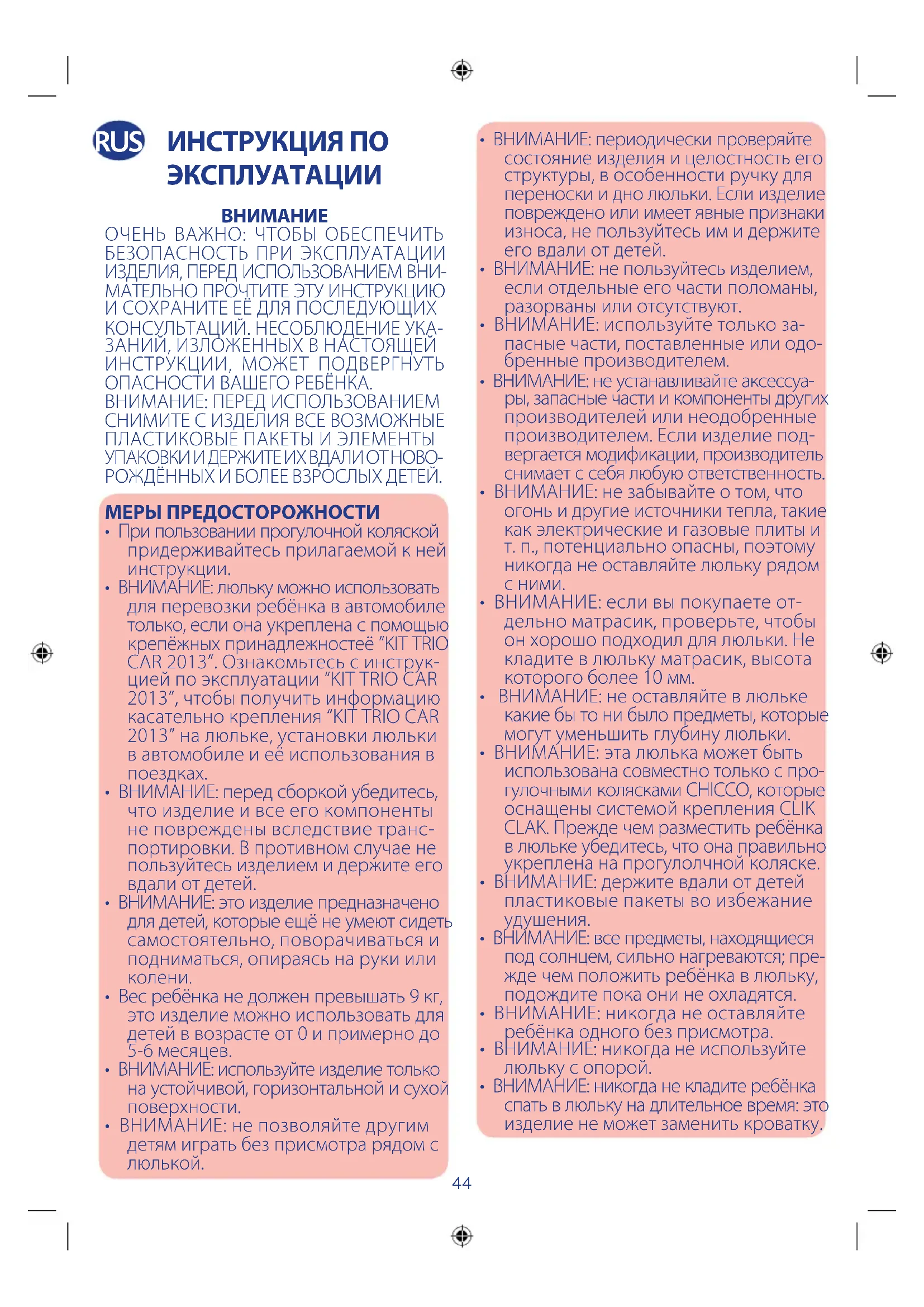 - ВНИМАНИЕ: никогда не кладите ребёнка спать в люльку на длительное время: это изделие не может заменить кроватку. RUS