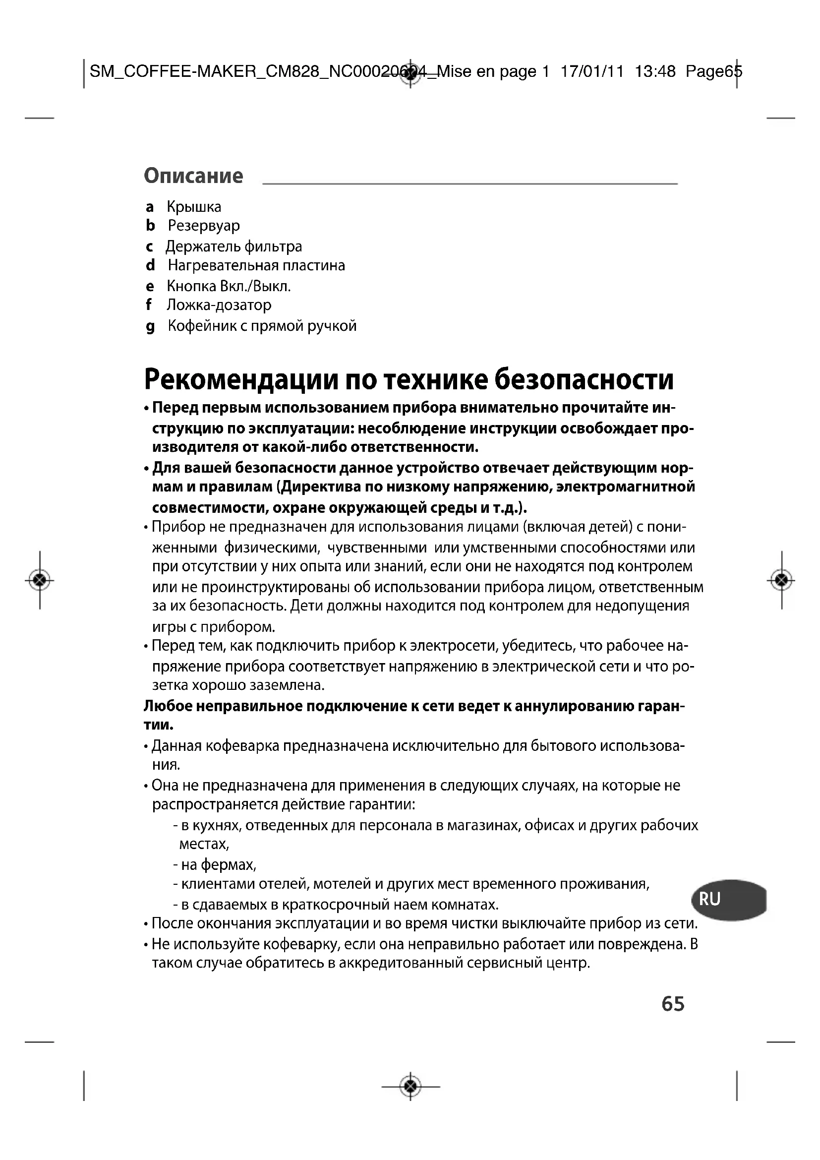 - Не используйте кофеварку, если она неправильно работает или повреждена. В таком случае обратитесь в аккредитованный сервисный центр. SM_COFFEE-MAKER_CM828_NC00020604_Mise en page 1 17/01/11 13:48 Page6566