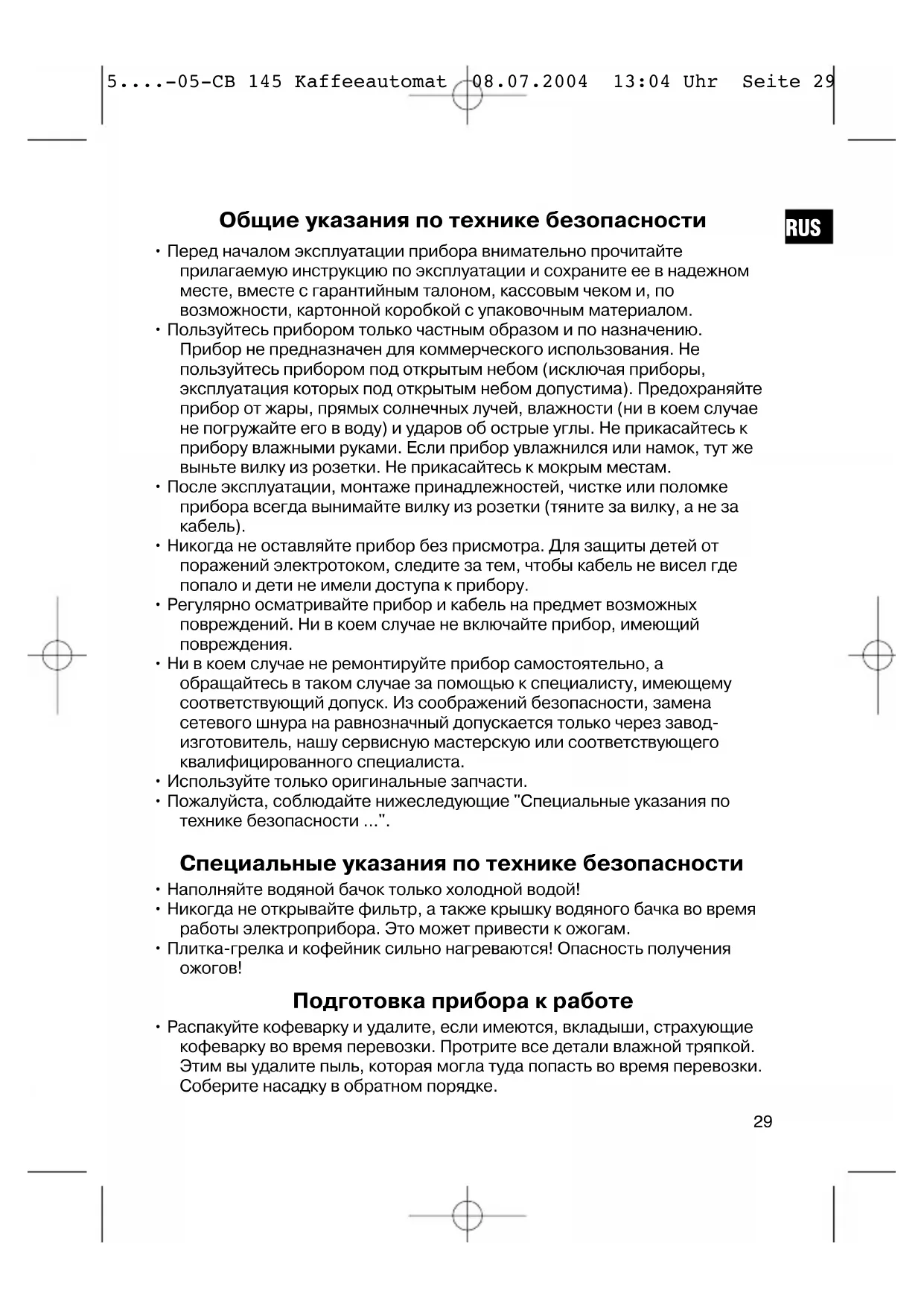 RUS 5....-05-CB 145 Kaffeeautomat 08.07.2004 13:04 Uhr Seite 29• Перед первым приготовлением кофе прогоните кофеварку для очистки 2-3 раза только с применением холодной воды. Подключение к сети