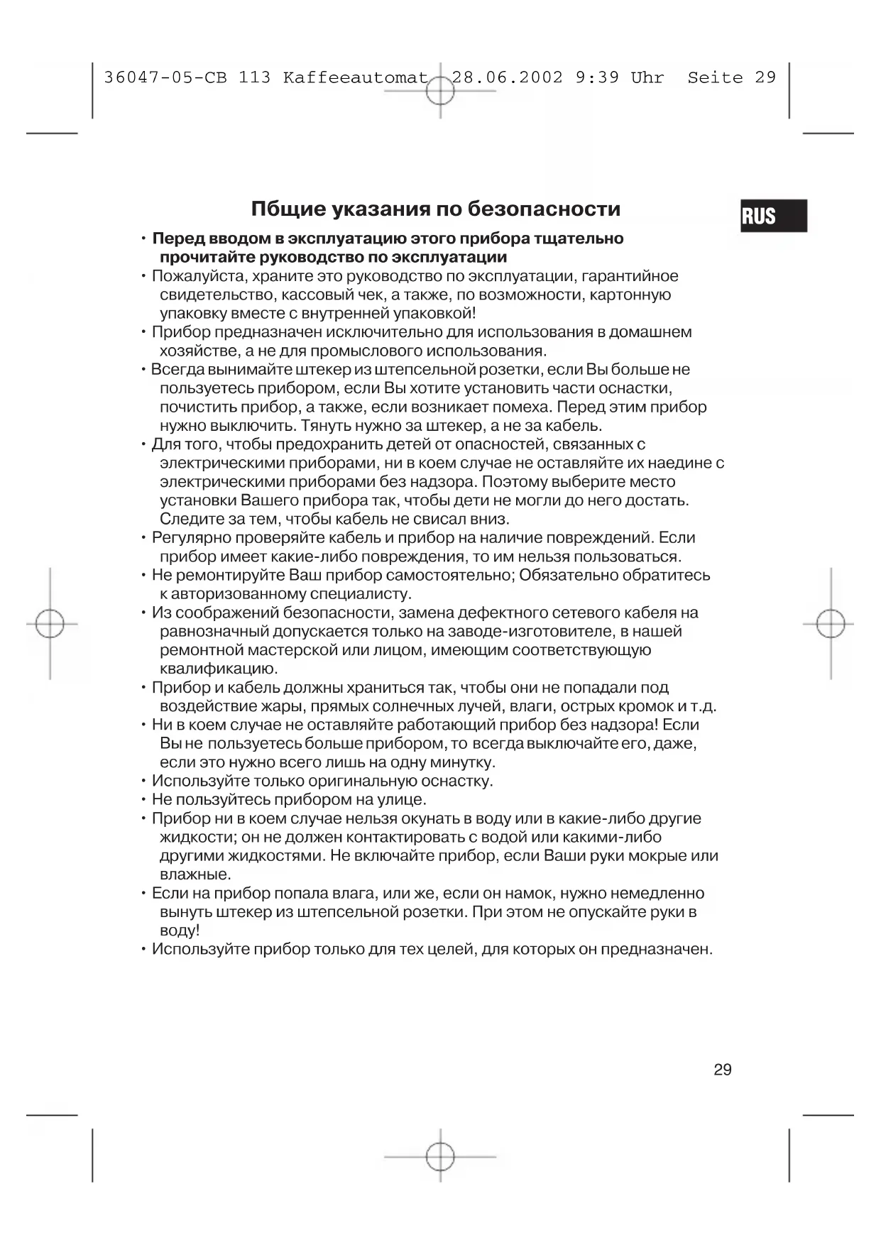 RUS 36047-05-CB 113 Kaffeeautomat 28.06.2002 9:39 Uhr Seite 29Специальные меры предосторожности при пользовании прибором