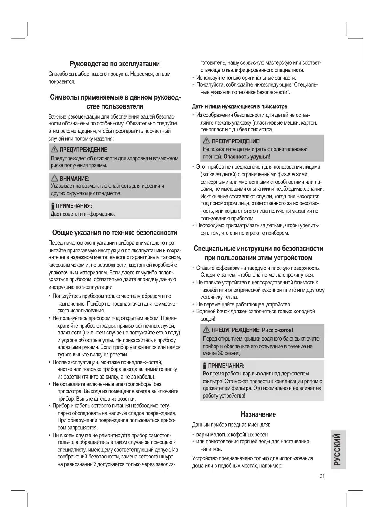 Устройство предназначено только для использования дома или в подобных местах, например: Руководство по эксплуатации Спасибо за выбор нашего продукта. Надеемся, он вам понравится. Символы применяемые в данном руковод- стве пользователя Важные рекомендации для обеспечения вашей безопас- ности обозначены по особенному. Обязательно следуйте этим рекомендациям, чтобы преотвратить несчастный случай или поломку изделия: ПРЕДУПРЕЖДЕНИЕ: Предупреждает об опасности для здоровья и возможном риске получения травмы.