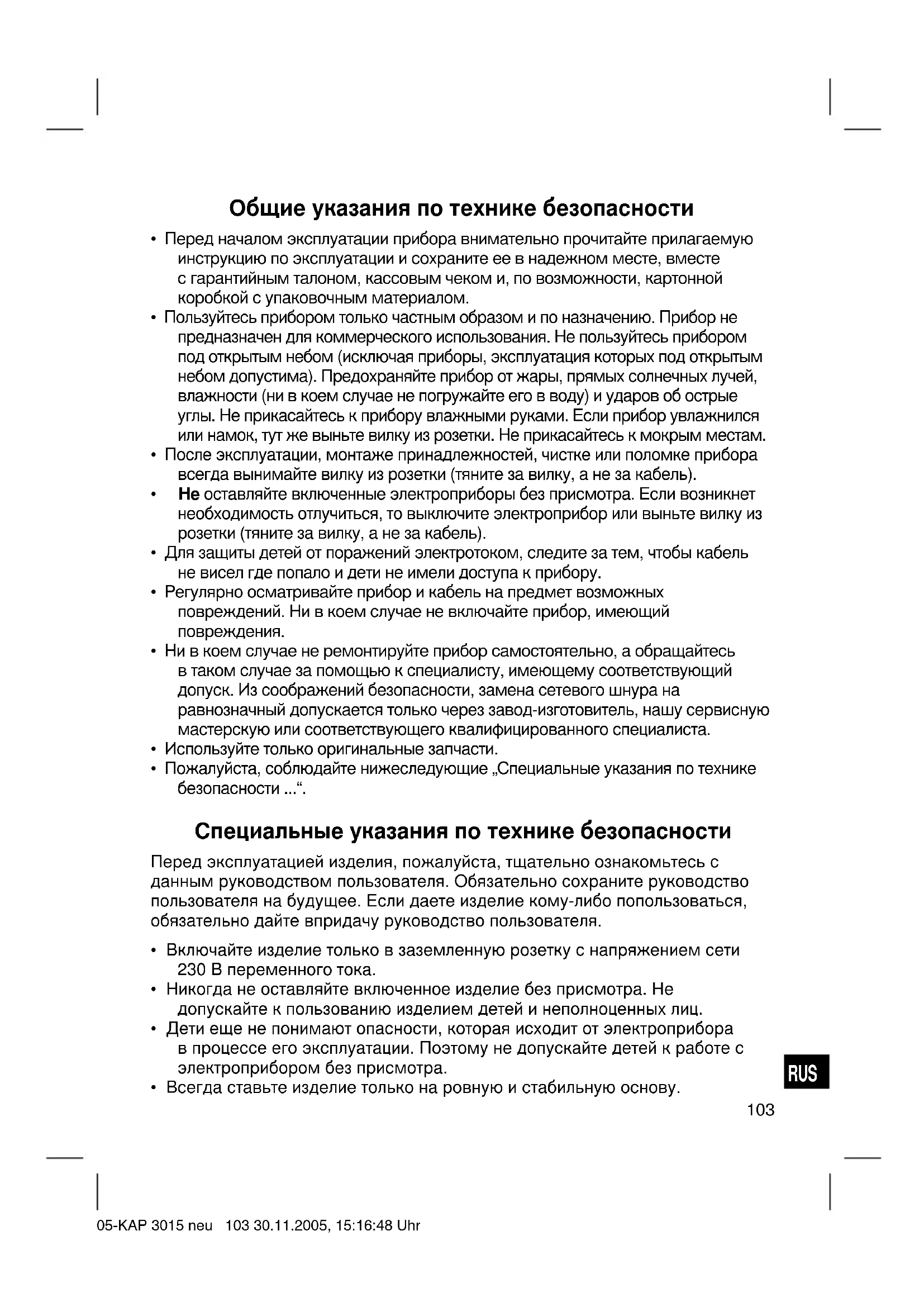- Выключите изделие, выньте штепсель из розетки и дайте ему остыть. 05-KAP 3015 neu 107 30.11.2005, 15:16:52 UhrRUS