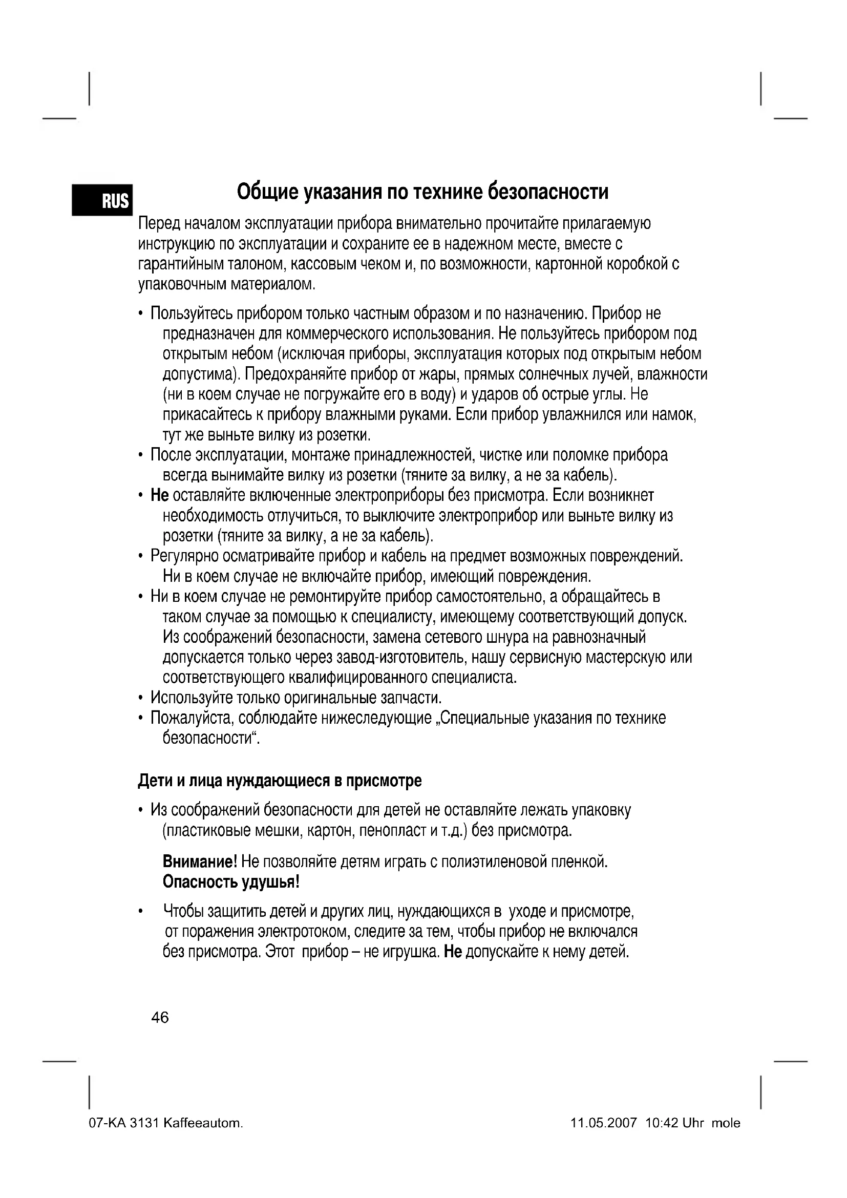 - Пожалуйста, соблюдайте нижеследующие „Специальные указания по технике безопасности“. 07-KA 3131 Kaffeeautom. 11.05.2007 10:42 Uhr mole Дети и лица нуждающиеся в присмотре