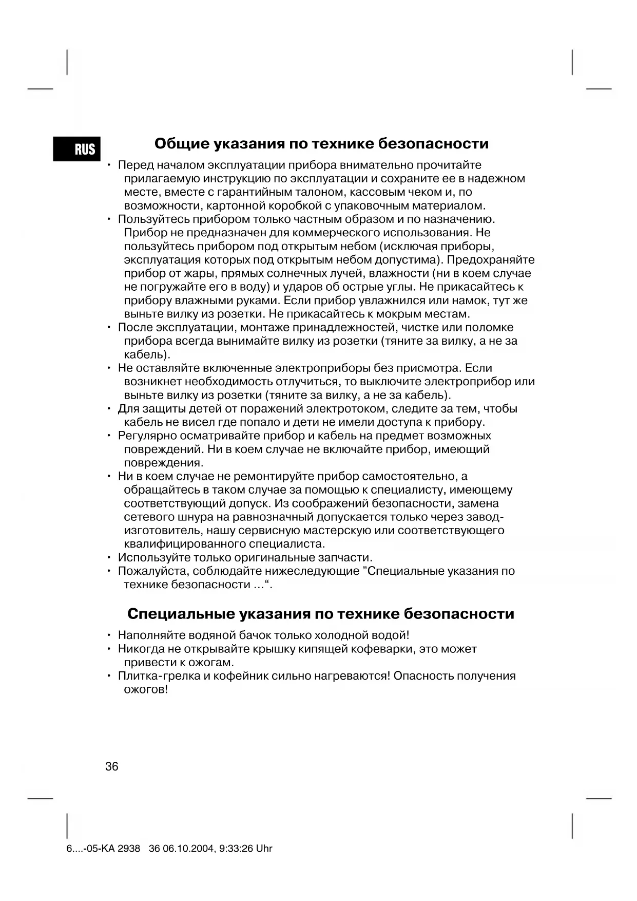 переключатель в положении ”I“. Плитка будет подогревать кофе до тех пор пока не переключите на ”O“. 6....-05-KA 2938 37 06.10.2004, 9:33:27 UhrRUS