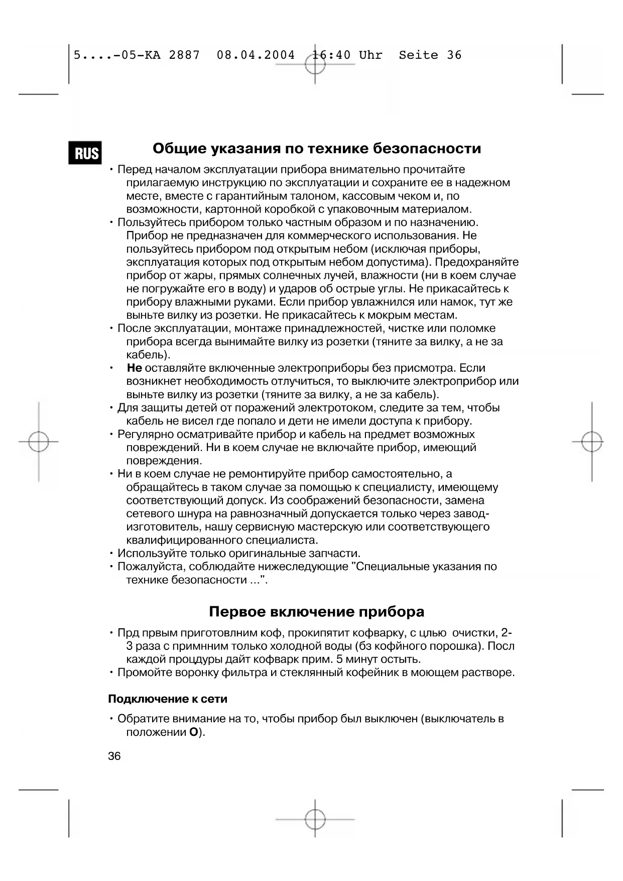 RUS 5....-05-KA 2887 08.04.2004 16:40 Uhr Seite 36• Перед включением прибора в розетку проверьте соответствие напряжения используемой сети с напряжением прибора, информация к этому находится на табличке прибора