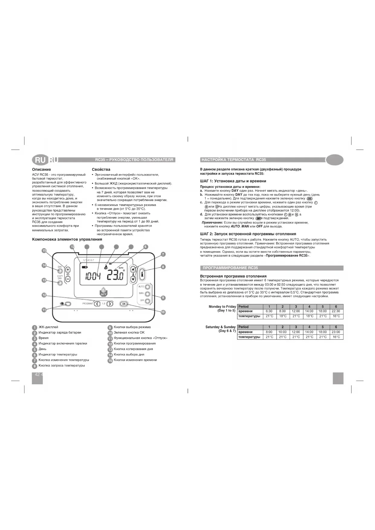 Скачайте инструкцию для вашего Термостат в формате PDF бесплатно! Найдите своё руководство RC35 - ACV и возьмите своё электронное устройство обратно в руки. На этой странице опубликованы все документы, необходимые для использования вашего устройства. RC35 бренда ACV.