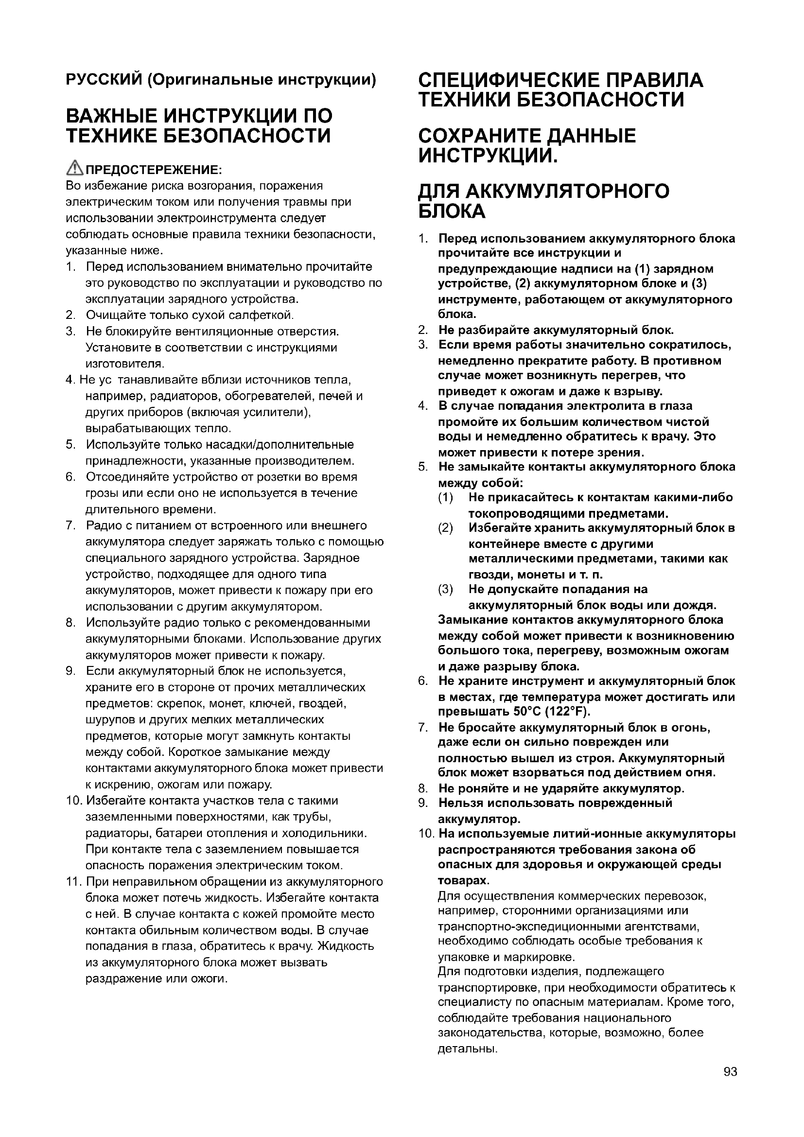 блока может потечь жидкость. Избегайте контакта с ней. В случае контакта с кожей промойте место контакта обильным количеством воды. В случае попадания в глаза, обратитесь к врачу. Жидкость из аккумуляторного блока может вызвать раздражение или ожоги. СПЕЦИФИЧЕСКИЕ ПРАВИЛА ТЕХНИКИ БЕЗОПАСНОСТИ СОХРАНИТЕ ДАННЫЕ ИНСТРУКЦИИ. ДЛЯ АККУМУЛЯТОРНОГО