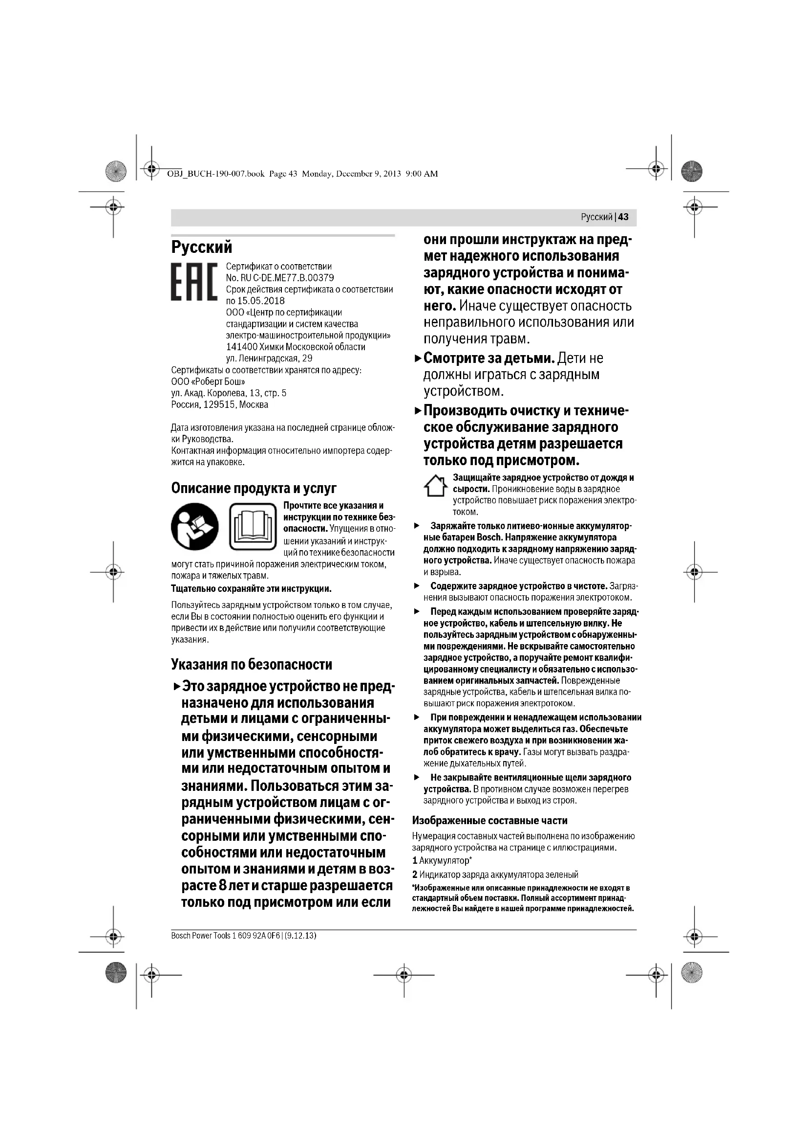 Сертификат о соответствии No. RU C-DE.ME77.B.00379 Срок действия сертификата о соответствии по 15.05.2018 ООО «Центр по сертификации стандартизации и систем качества электро-машиностроительной продукции» 141400 Химки Московской области ул. Ленинградская, 29 Сертификаты о соответствии хранятся по адресу: ООО «Роберт Бош» ул. Акад. Королева, 13, стр. 5 Россия, 129515, Москва Дата изготовления указана на последней странице облож- ки Руководства. Контактная информация относительно импортера содер- жится на упаковке. Описание продукта и услуг Прочтите все указания и инструкции по технике без- опасности. Упущения в отно- шении указаний и инструк- ций по технике безопасности могут стать причиной поражения электрическим током, пожара и тяжелых травм. Тщательно сохраняйте эти инструкции. Пользуйтесь зарядным устройством только в том случае, если Вы в состоянии полностью оценить его функции и привести их в действие или получили соответствующие