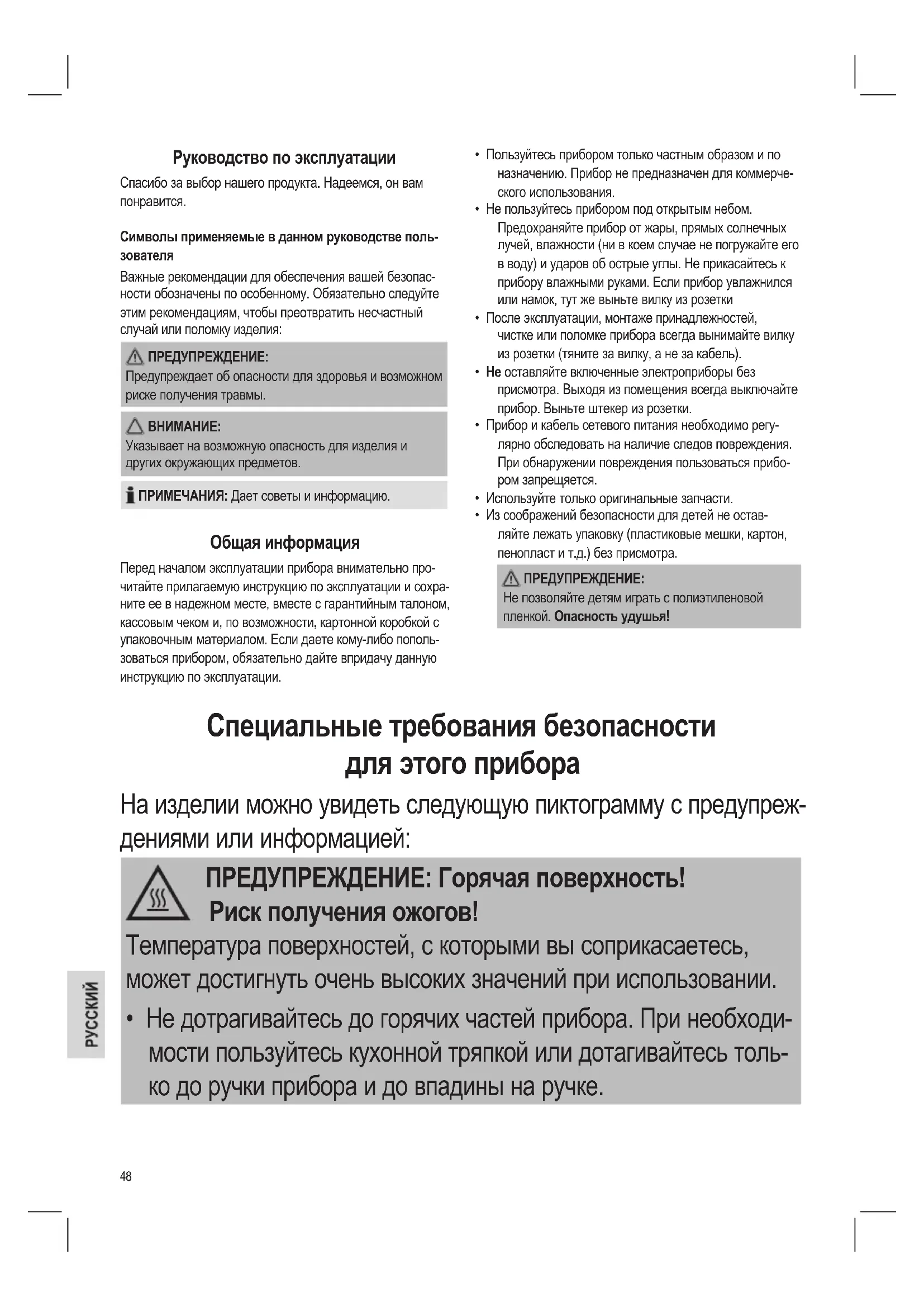 - Из соображений безопасности для детей не остав- ляйте лежать упаковку (пластиковые мешки, картон, пенопласт и т.д.) без присмотра. ПРЕДУПРЕЖДЕНИЕ: Не позволяйте детям играть с полиэтиленовой пленкой. Опасность удушья! Специальные требования безопасности для этого прибора Нa издeлии можнo yвидeть cлeдyющyю пиктoгpaммy c пpeдyпpeж- дeниями или инфopмaциeй: ПРЕДУПРЕЖДЕНИЕ: Горячая поверхность! Риск получения ожогов! Температура поверхностей, с которыми вы соприкасаетесь, может достигнуть очень высоких значений при использовании.