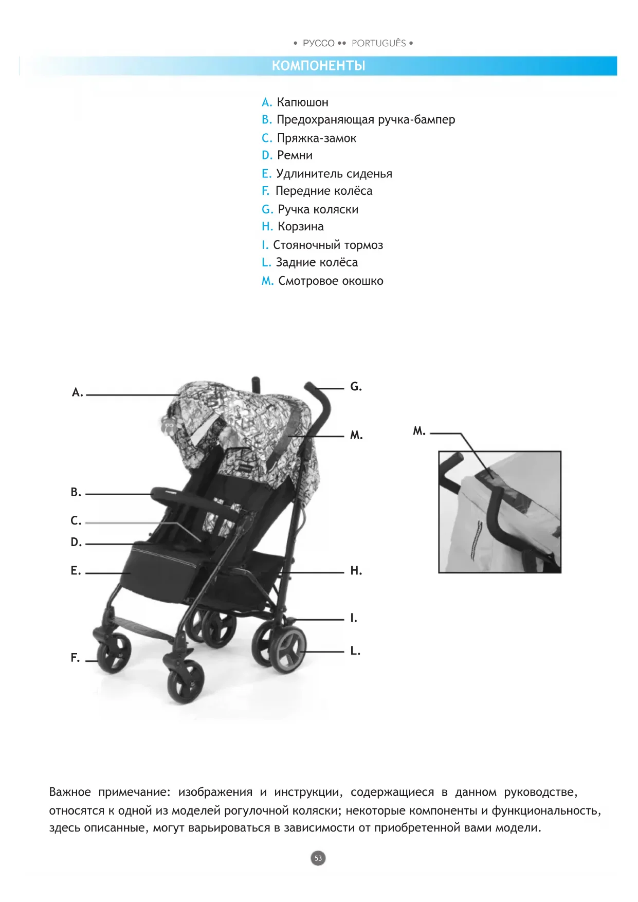 Важное примечание: изображения и инструкции, содержащиеся в данном руководстве, относятся к одной из моделей рогулочной коляски; некоторые компоненты и функциональность, здесь описанные, могут варьироваться в зависимости от приобретенной вами модели. A. Капюшон B. Предохраняющая ручка-бампер C. Пряжка-замок D. Ремни E. Удлинитель сиденья F. Передние колёса G. Ручка коляски H. Корзина