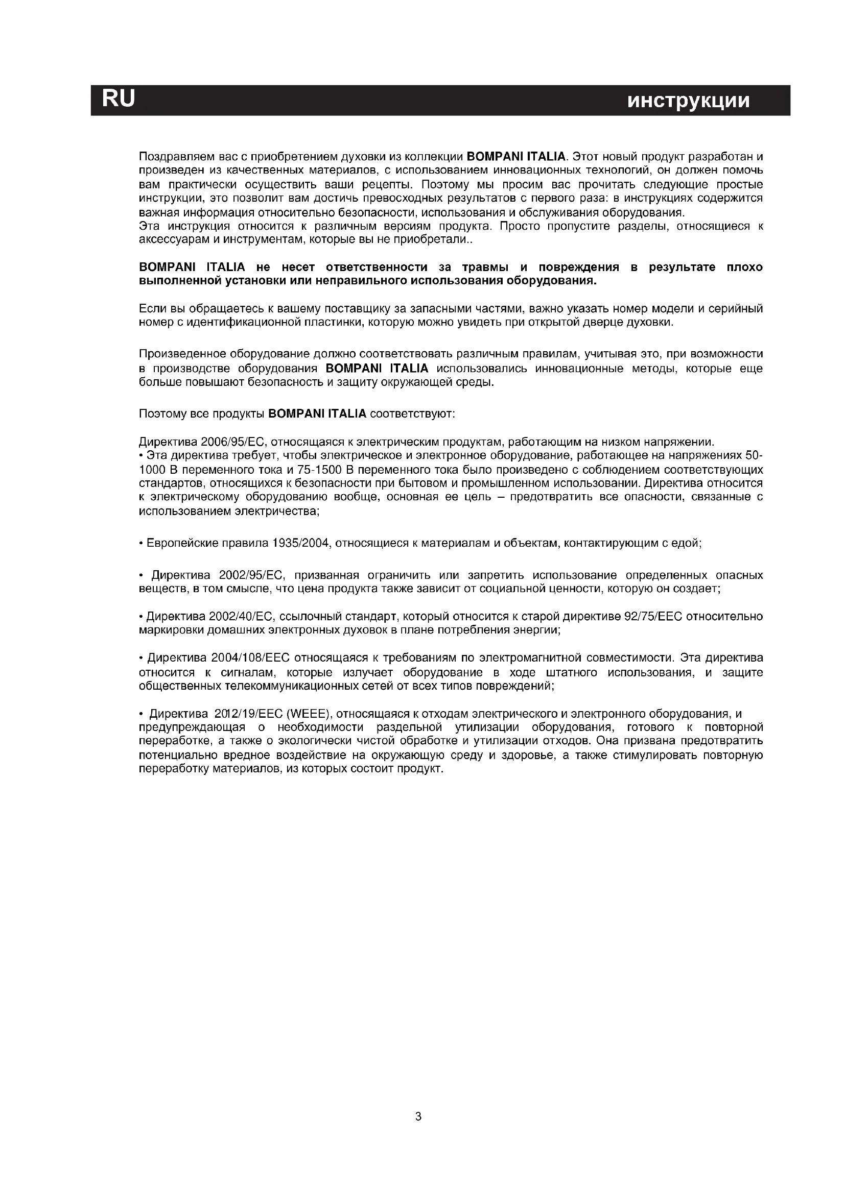 СОДЕРЖАНИЕПоздравляем вас с приобретением духовки из коллекции BOMPANI ITALIA. Этот новый продукт разработан и произведен из качественных материалов, с использованием инновационных технологий, он должен помочь вам практически осуществить ваши рецепты. Поэтому мы просим вас прочитать следующие простые инструкции, это позволит вам достичь превосходных результатов с первого раза: в инструкциях содержится важная информация относительно безопасности, использования и обслуживания оборудования. Эта инструкция относится к различным версиям продукта. Просто пропустите разделы, относящиеся к аксессуарам и инструментам, которые вы не приобретали.. BOMPANI ITALIA не несет ответственности за травмы и повреждения в результате плохо выполненной установки или неправильного использования оборудования. Если вы обращаетесь к вашему поставщику за запасными частями, важно указать номер модели и серийный номер с идентификационной пластинки, которую можно увидеть при открытой дверце духовки. Произведенное оборудование должно соответствовать различным правилам, учитывая это, при возможности в производстве оборудования BOMPANI ITALIA использовались инновационные методы, которые еще больше повышают безопасность и защиту окружающей среды. Поэтому все продукты BOMPANI ITALIA соответствуют: Директива 2006/95/EC, относящаяся к электрическим продуктам, работающим на низком напряжении.