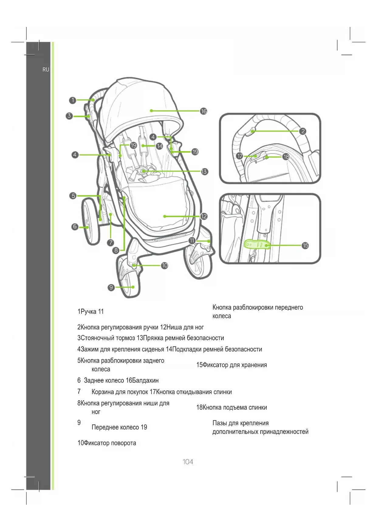 Переднее колесо 19 Пазы для крепления дополнительных принадлежностей 10 Фиксатор поворота