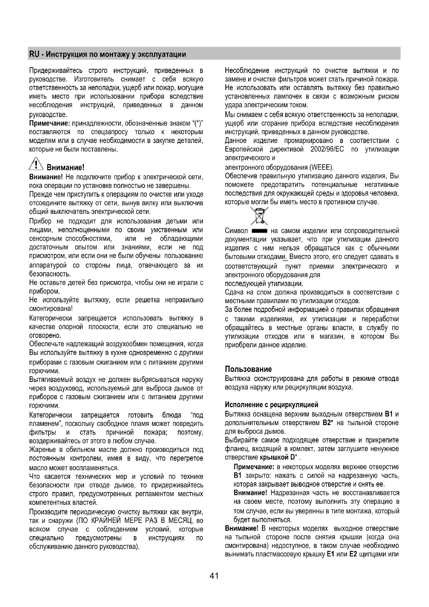 Категорически запрещается готовить блюда “под пламенем”, поскольку свободное пламя может повредить фильтры и стать причиной пожара; поэтому, воздерживайтесь от этого в любом случае. Жаренье в обильном масле должно производиться под постоянным контролем, имея в виду, что перегретое масло может воспламеняться. Что касается технических мер и условий по технике безопасности при отводе дымов, то придерживайтесь строго правил, предусмотренных регламентом местных компетентных властей. Производите периодическую очистку вытяжки как внутри, так и снаружи (ПО КРАЙНЕЙ МЕРЕ РАЗ В МЕСЯЦ, во всяком случае с соблюдением условий, которые специально предусмотрены в инструкциях по обслуживанию данного руководства). Несоблюдение инструкций по очистке вытяжки и по замене и очистке фильтров может стать причиной пожара. Не использовать или оставлять вытяжку без правильно установленных лампочек в связи с возможным риском удара электрическим током. Мы снимаем с себя всякую ответственность за неполадки, ущерб или сгорание прибора вследствие несоблюдения инструкций, приведенных в данном руководстве. Данное изделие промаркировано в соответствии с Европейской директивой 2002/96/EC по утилизации электрического и электронного оборудования (WEEE). Обеспечив правильную утилизацию данного изделия, Вы поможете предотвратить потенциальные негативные последствия для окружающей среды и здоровья человека, которые могли бы иметь место в противном случае.