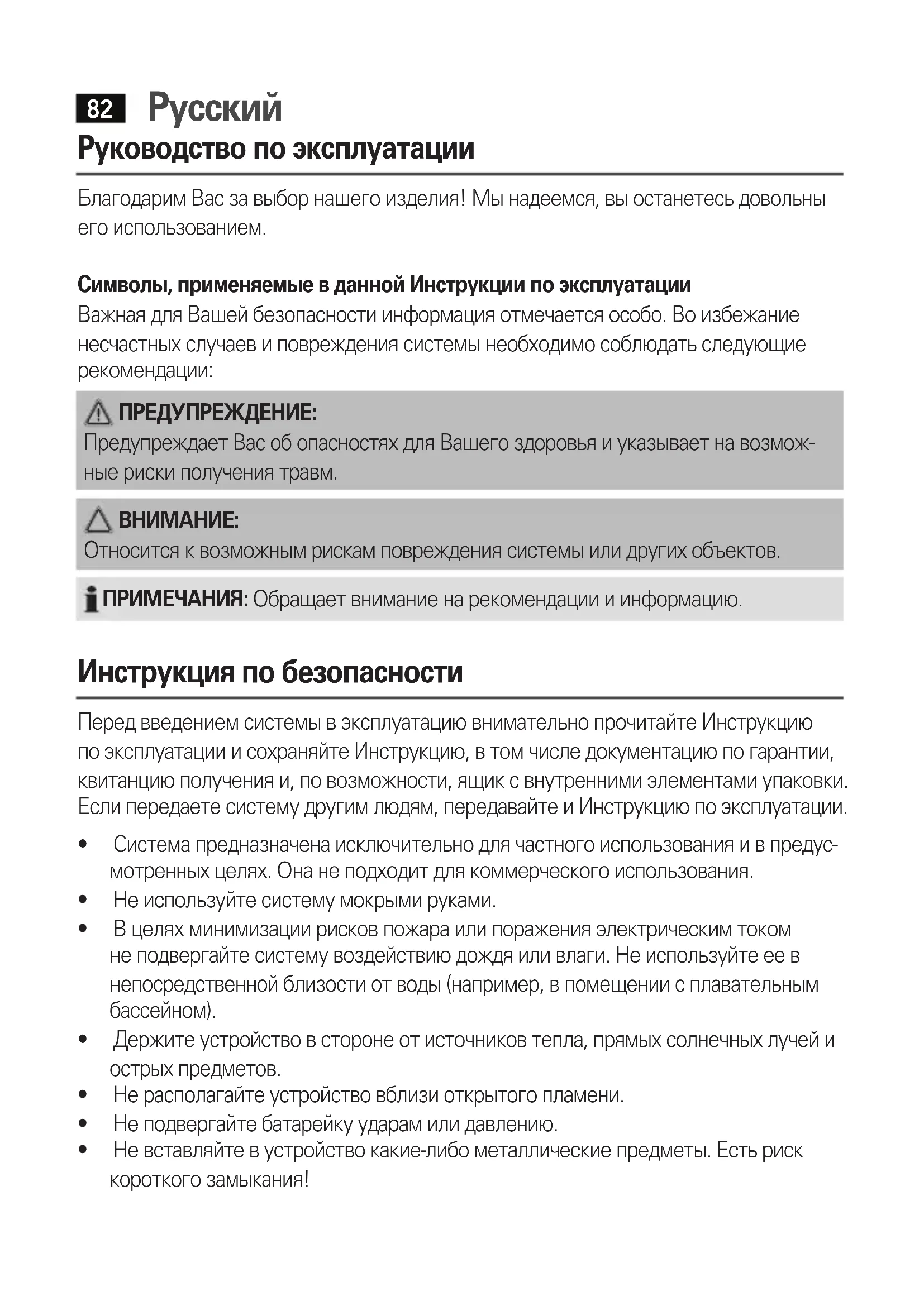 Руководство по эксплуатации БлагодаримВасзавыборнашегоизделия!Мынадеемся,выостанетесьдовольны его использованием. Символы, применяемые в данной Инструкции по эксплуатации Важная для Вашей безопасности информация отмечается особо. Во избежание несчастных случаев и повреждения системы необходимо соблюдать следующие рекомендации: ПРЕДУПРЕЖДЕНИЕ: Предупреждает Вас об опасностях для Вашего здоровья и указывает на возмож- ные риски получения травм.