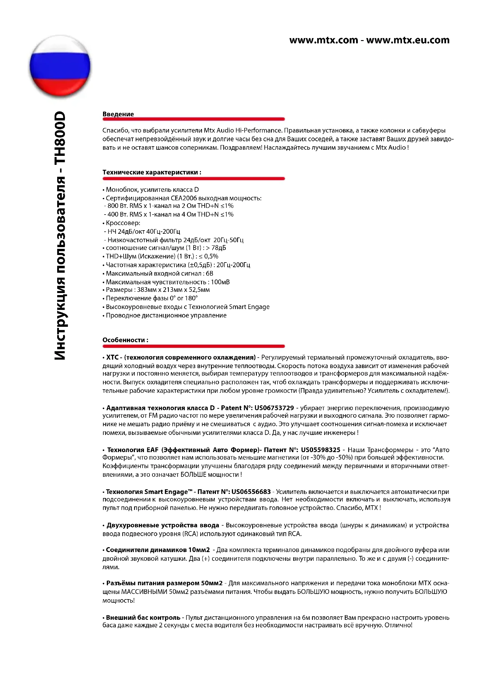 РУКОВОДСТВО ПОЛЬЗОВАТЕЛЯ TH800D MTX Audio