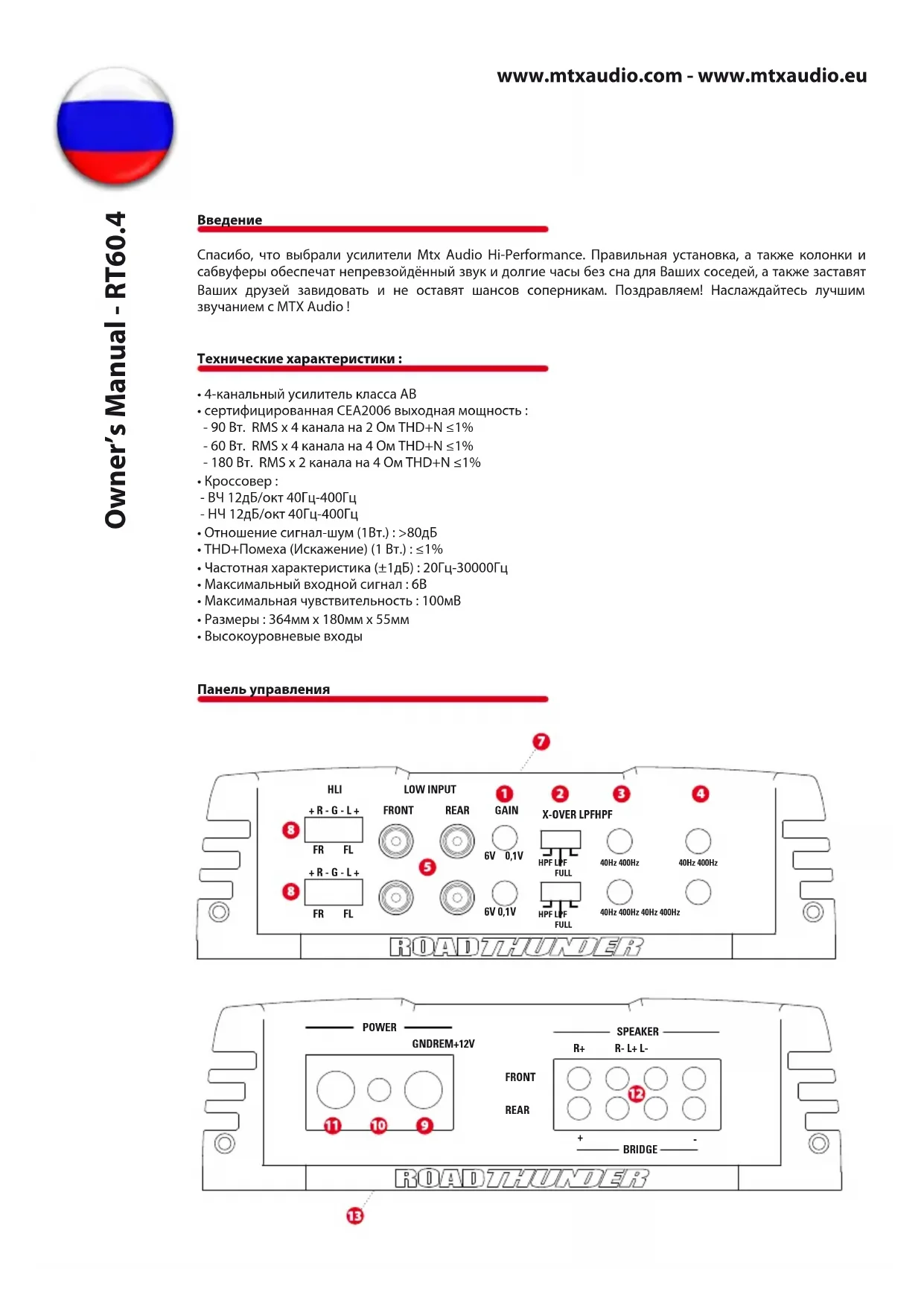 - В положении «FULL» кроссовер выключен. Регулятор частоты разделительного фильтра ВЧ (HPF) : Используется для выбора желаемой частоты раз- делительного фильтра ВЧ. Частота настраивается от 40Гц до 400Гц. Регулятор частоты разделительного фильтра НЧ (LPF) : Используется для выбора желаемой частоты раз- делительного фильтра НЧ. Частота настраивается от 40Гц до 400Гц. Входные разъёмы RCA (LOW INPUT) : Данные входные разъёмы RCA используются с источниками сигнала, у которых имеется RCA или линейные уровни выходных сигналов.(Для надлежащего функционирования усилителя минимальный уровень источника сигнала должен быть 100мВ.) MТХ рекомендует только высококачественный кабель с витыми жилами (например StreetWires), чтобы снизить вероятность попадания шума в систему. Включено/Защитный LED : Данный LED светится красным, когда усилитель включен. Когда работает термо- защита или защита от короткого замыкания, LED мигает. Разъёмы динамиков (HLI) : Данный разъем позволяет усилителю работать от источника сигнала. Провода от источника сигнала должны быть присоединены непосредственно к монтажному жгуту, прилагающему- ся к усилителю. Примечание: при использховании входных разъемов динамиков включать и выключать усилитель нужно дистанционно. (+12V) Разъём питания - Это основоной разъём питания усилителя и для надлежащего рабочего состоя- ния он должен быть подключён непосредственно к плюсовому гнезду аккумулятора автомобиля. Будьте осторожны, устанавливая этот кабель. Избегайте нахождения данного кабеля поблизости кабелей RCA, антенн или другого чувствительного оборудования из-за риска проникновения шумов в аудио систему, вызванного большим потоком тока. Также для более качественной эксплуатации важно прочное и надёж- ное подсоединение. MTX рекомендует использовать провод размером 10мм2 с усилителем MTX RT60.4. Разъём дистанционного включения (REM) : Усилитель может быть включён при подаче 12В к данному разъ- ёму. Обычно такое напряжение подаётся при помощи провода от источника питания с пометкой «remote» (дистанционный) or «power antenna» (антенна с электроприводом). Разъём заземления (GND) : Качественное заземление необходимо для того, чтобы Ваш усилитель работал на полную мощность. Следует использовать небольшой провод того же диаметра, что и провод питания для подсоединения клеммы заземления непосредственно к шасси автомобиля. Всегда зачищайте поверх- ность, к которой будет выполняться заземление. Разъёмы динамиков (SPEAKER) : Подсоедините динамики к данным разъёмам. Обратите внимание на пра- вильность полярности системы.Неправильная фаза может причинить потерю диапазона баса и/или не- качественное звучание в целом. Мостовой режим: При подсоединении усилителя используйте только левый положительный и правый отрицательный разъёмы. Внимание: Не подсоединяйте усилитель при сопротивлении ниже 4 Ом. Предохранители (FUSE) : При сгорании предохранителей замените их на аналогичные. Никогда на заме- няйте их на предохранители классом выше ! Внимание : Предохранители располагаются под усилителем.www.mtxaudio.com - www.mtxaudio.eu Owner’s Manual - RT60.4 Установка и монтаж MTX рекомендует устанавливать Ваш новый усилитель RoadTHUNDER авторизированным представителем MTX. Малейшее отклонение от специальных инструкций по установке может нанести серьезный вред уси- лителю, динамикам и/или электрической системе автомобиля. Ущерб, пр