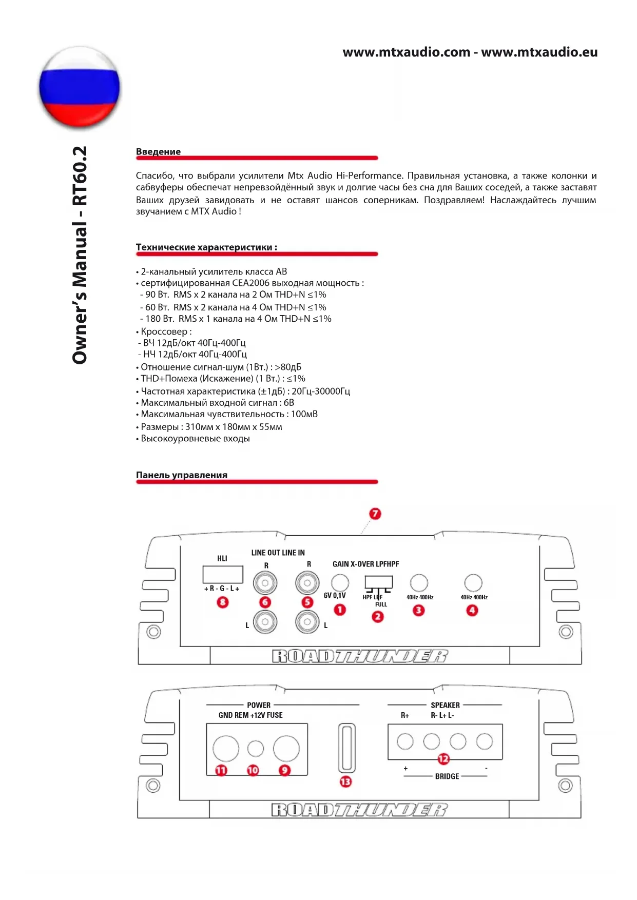- В положении «FULL» кроссовер выключен. Регулятор частоты разделительного фильтра ВЧ (HPF) : Используется для выбора желаемой частоты раз- делительного фильтра ВЧ. Частота настраивается от 40Гц до 400Гц. Регулятор частоты разделительного фильтра НЧ (LPF) : Используется для выбора желаемой частоты раз- делительного фильтра НЧ. Частота настраивается от 40Гц до 400Гц. Входные разъёмы RCA (LOW INPUT) : Данные входные разъёмы RCA используются с источниками сигнала, у которых имеется RCA или линейные уровни выходных сигналов.(Для надлежащего функционирования усилителя минимальный уровень источника сигнала должен быть 100мВ.) MТХ рекомендует только высококачественный кабель с витыми жилами (например StreetWires), чтобы снизить вероятность попадания шума в систему. Выходные разъёмы RCA (LINE OUT) : данные разъёмы предназначены для подсоединения усилителей к стерео RCA от источника сигнала при шлейфовом подключении Включено/Защитный LED : Данный LED светится красным, когда усилитель включен. Когда работает термо- защита или защита от короткого замыкания, LED мигает. Разъёмы динамиков (HLI) : Данный разъем позволяет усилителю работать от источника сигнала. Провода от источника сигнала должны быть присоединены непосредственно к монтажному жгуту, прилагающему- ся к усилителю. Примечание: при использховании входных разъемов динамиков включать и выключать усилитель нужно дистанционно. (+12V) Разъём питания - Это основоной разъём питания усилителя и для надлежащего рабочего состоя- ния он должен быть подключён непосредственно к плюсовому гнезду аккумулятора автомобиля. Будьте осторожны, устанавливая этот кабель. Избегайте нахождения данного кабеля поблизости кабелей RCA, антенн или другого чувствительного оборудования из-за риска проникновения шумов в аудио систему, вызванного большим потоком тока. Также для более качественной эксплуатации важно прочное и надёж- ное подсоединение. MTX рекомендует использовать провод размером 10мм2 с усилителем MTX RT60.2. Разъём дистанционного включения (REM) : Усилитель может быть включён при подаче 12В к данному разъ- ёму. Обычно такое напряжение подаётся при помощи провода от источника питания с пометкой «remote» (дистанционный) or «power antenna» (антенна с электроприводом). Разъём заземления (GND) : Качественное заземление необходимо для того, чтобы Ваш усилитель работал на полную мощность. Следует использовать небольшой провод того же диаметра, что и провод питания для подсоединения клеммы заземления непосредственно к шасси автомобиля. Всегда зачищайте поверх- ность, к которой будет выполняться заземление. Разъёмы динамиков (SPEAKER) : Подсоедините динамики к данным разъёмам. Обратите внимание на пра- вильность полярности системы.Неправильная фаза может причинить потерю диапазона баса и/или не- качественное звучание в целом. Мостовой режим: При подсоединении усилителя используйте только левый положительный и правый отрицательный разъёмы. Внимание: Не подсоединяйте усилитель при сопротивлении ниже 4 Ом. Предохранители (FUSE) : При сгорании предохранителей замените их на аналогичные. Никогда на заме- няйте их на предохранители классом выше !www.mtxaudio.com - www.mtxaudio.eu Owner’s Manual - RT60.2 Установка и монтаж MTX рекомендует устанавливать Ваш новый усилитель RoadTHUNDER авторизированным представителем MTX. Малейшее отклонение от специальных инструкций по установке может нанес