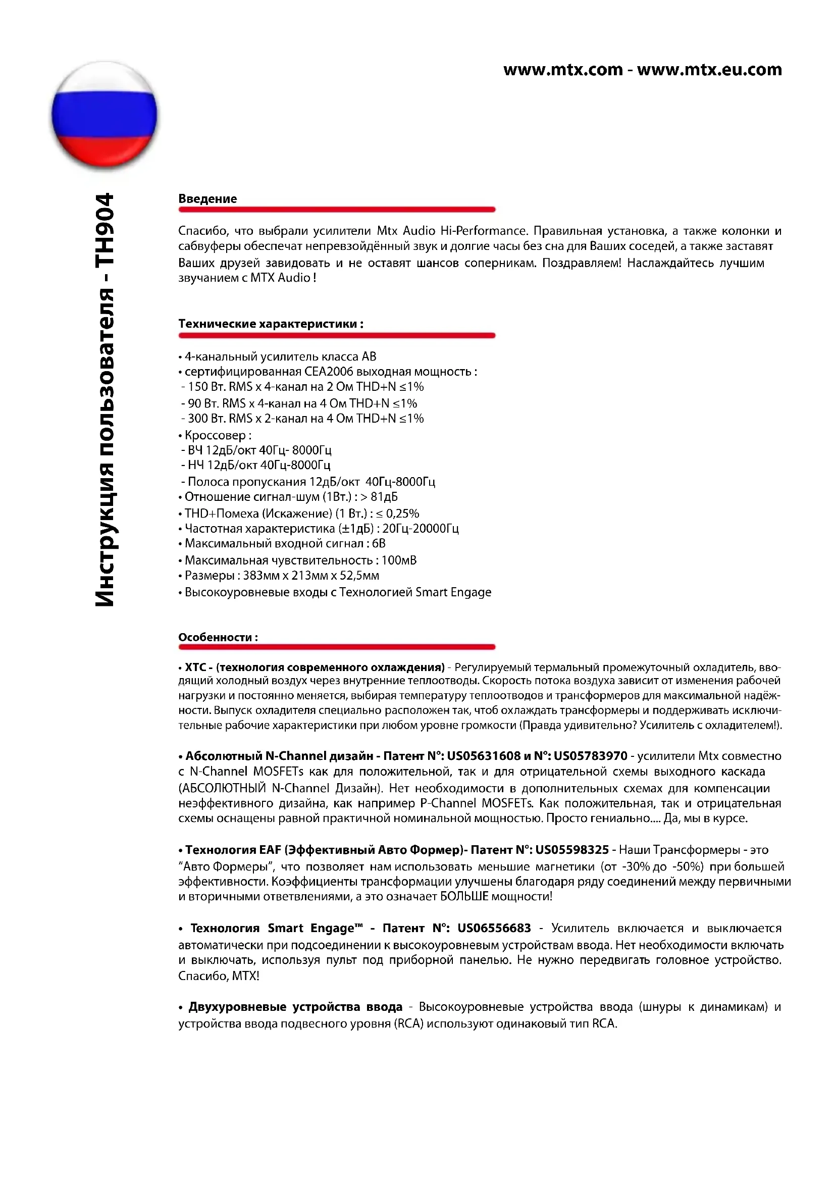 РУКОВОДСТВО ПОЛЬЗОВАТЕЛЯ TH904 MTX Audio
