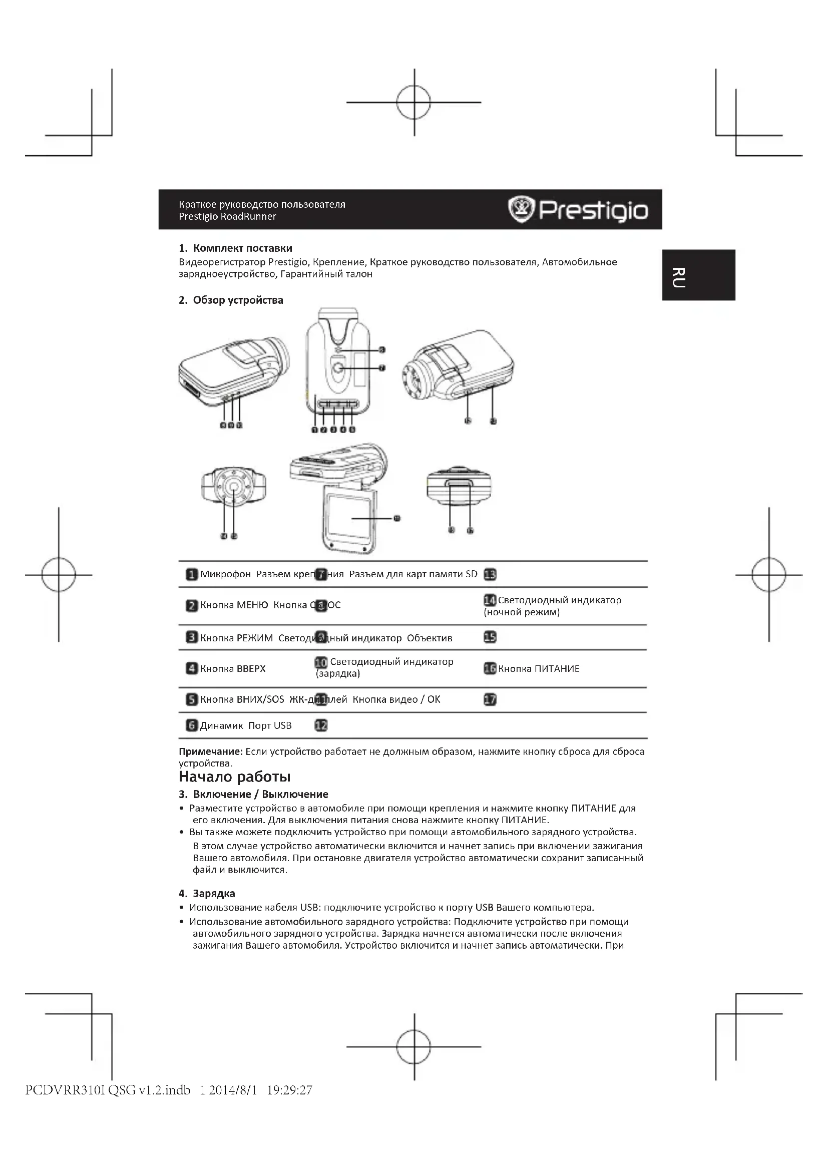 - Использование автомобильного зарядного устройства: Подключите устройство при помощи автомобильного зарядного устройства. Зарядка начнется автоматически после включения зажигания Вашего автомобиля. Устройство включится и начнет запись автоматически. При PCDVRR310I QSG v1.2.indb 1 2014/8/1 19:29:27Краткое руководство пользователя Prestigio RoadRunner