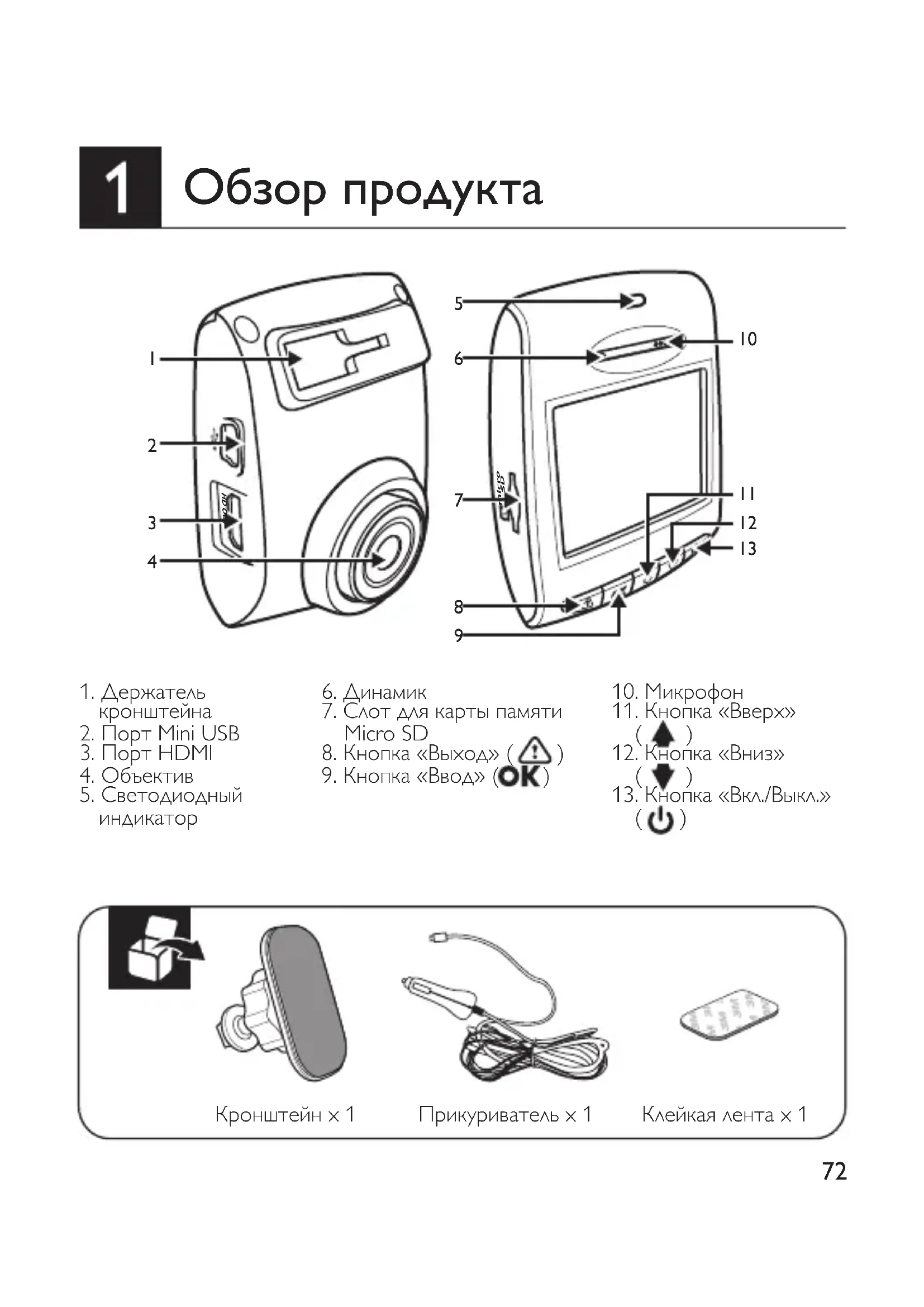 DDR2 SDRAM, 64 M x 16 бит (1 Гбит/с) Внутренняяпамять SPI Flash, 64 МБ Носительинформации Карта памяти Micro SD (класс 6 или выше, до 32 ГБ) Периодсохраненияпоказаний системныхчасов Не меньше 5 дней Времязаписи 200 мин при 16 ГБ в режиме Full HD 280 мин при 16 ГБ в режиме HD Premium Рабочаятемпература 0℃ ~ 65℃ Температурахранения -20℃ ~ 70℃ Комплектующие Автомобильное зарядное устройство с разъемом Mini USB, кронштейн для крепления, липкая лента