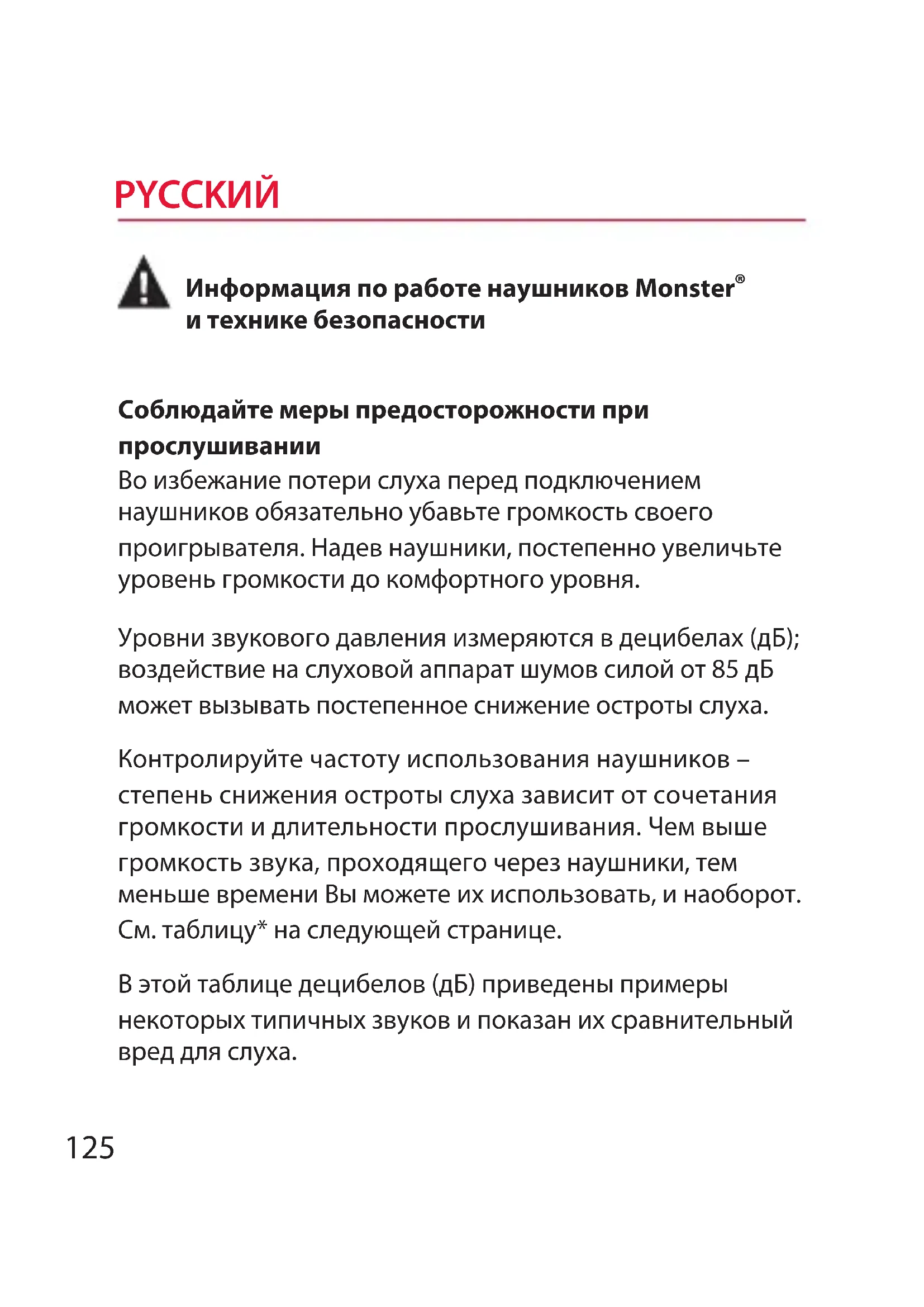 и технике безопасности Соблюдайте меры предосторожности при прослушивании Во избежание потери слуха перед подключением наушников обязательно убавьте громкость своего проигрывателя. Надев наушники, постепенно увеличьте уровень громкости до комфортного уровня. Уровни звукового давления измеряются в децибелах (дБ); воздействие на слуховой аппарат шумов силой от 85 дБ может вызывать постепенное снижение остроты слуха. Контролируйте частоту использования наушников – степень снижения остроты слуха зависит от сочетания громкости и длительности прослушивания. Чем выше громкость звука, проходящего через наушники, тем меньше времени Вы можете их использовать, и наоборот. См. таблицу* на следующей странице. В этой таблице децибелов (дБ) приведены примеры некоторых типичных звуков и показан их сравнительный вред для слуха. PYCCKИЙ 125ЗВУК УРОВЕНЬ