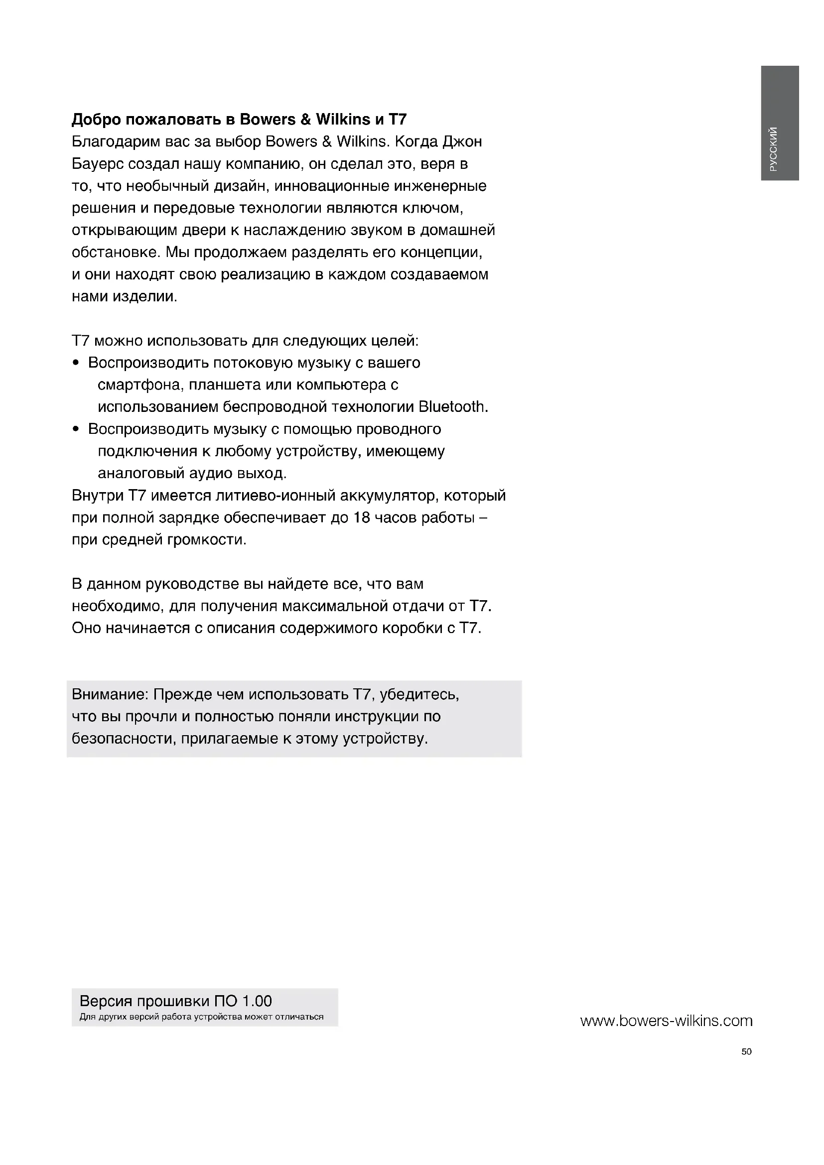 www.bowers-wilkins.com Добро пожаловать в Bowers & Wilkins и T7 Благодарим вас за выбор Bowers & Wilkins. Когда Джон Бауерс создал нашу компанию, он сделал это, веря в то, что необычный дизайн, инновационные инженерные решения и передовые технологии являются ключом, открывающим двери к наслаждению звуком в домашней обстановке. Мы продолжаем разделять его концепции, и они находят свою реализацию в каждом создаваемом нами изделии. T7 можно использовать для следующих целей:
