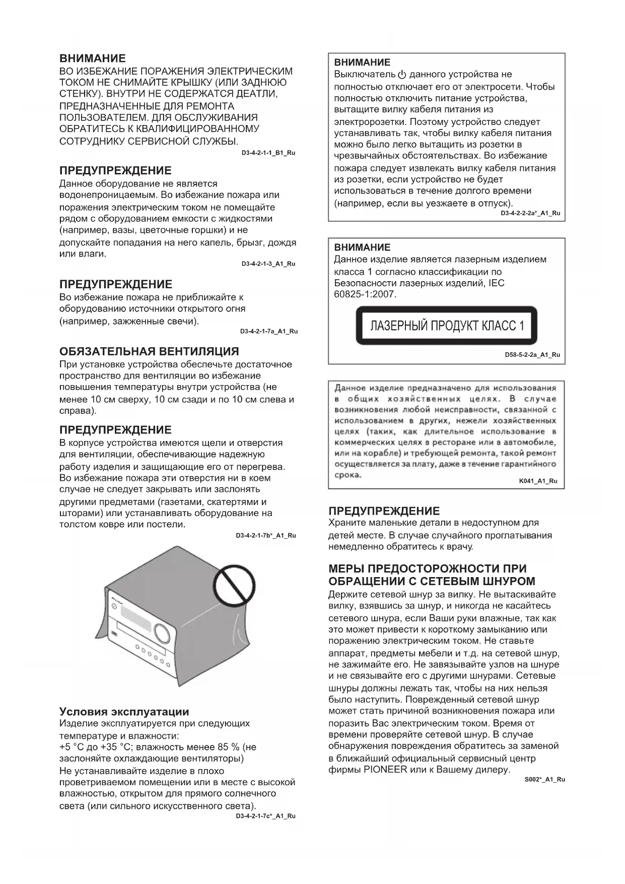 , 1kHz, 2-kan. gedreven) (IEC) X-EM16&26_TOC&Body_Nl.fm 15 ページ 2016年8月9日 火曜日 午後3時57分ВНИМАНИЕ ВО ИЗБЕЖАНИЕ ПОРАЖЕНИЯ ЭЛЕКТРИЧЕСКИМ ТОКОМ НЕ СНИМАЙТЕ КРЫШКУ (ИЛИ ЗАДНЮЮ СТЕНКУ). ВНУТРИ НЕ СОДЕРЖАТСЯ ДЕАТЛИ, ПРЕДНАЗНАЧЕННЫЕ ДЛЯ РЕМОНТА ПОЛЬЗОВАТЕЛЕМ. ДЛЯ ОБСЛУЖИВАНИЯ ОБРАТИТЕСЬ К КВАЛИФИЦИРОВАННОМУ СОТРУДНИКУ СЕРВИСНОЙ СЛУЖБЫ.D3-4-2-1-1_B1_Ru ПРЕДУПРЕЖДЕНИЕ Данное оборудование не является водонепроницаемым. Во избежание пожара или поражения электрическим током не помещайте рядом с оборудованием емкости с жидкостями (например, вазы, цветочные горшки) и не допускайте попадания на него капель, брызг, дождя или влаги.D3-4-2-1-3_A1_Ru ОБЯЗАТЕЛЬНАЯ ВЕНТИЛЯЦИЯ При установке устройства обеспечьте достаточное пространство для вентиляции во избежание повышения температуры внутри устройства (не менее 10 см сверху, 10 см сзади и по 10 см слева и справа). ПРЕДУПРЕЖДЕНИЕ В корпусе устройства имеются щели и отверстия для вентиляции, обеспечивающие надежную работу изделия и защищающие его от перегрева. Во избежание пожара эти отверстия ни в коем случае не следует закрывать или заслонять другими предметами (газетами, скатертями и шторами) или устанавливать оборудование на толстом ковре или постели.D3-4-2-1-7b*_A1_Ru Условия эксплуатации Изделие эксплуатируется при следующих температуре и влажности:+5 °C до +35 °C; влажность менее 85 % (не заслоняйте охлаждающие вентиляторы)Не устанавливайте изделие в плохо проветриваемом помещении или в месте с высокой влажностью, открытом для прямого солнечного света (или сильного искусственного света).D3-4-2-1-7c*_A1_RuВНИМАНИЕДанное изделие является лазерным изделием класса 1 согласно классификации по Безопасности лазерных изделий, IEC 60825-1:2007. ЛАЗЕРНЫЙ ПРОДУКТ КЛАСС 1 D58-5-2-2a_A1_RuK041_A1_Ru МЕРЫ ПРЕДОСТОРОЖНОСТИ ПРИ ОБРАЩЕНИИ С СЕТЕВЫМ ШНУРОМ Держите сетевой шнур за вилку. Не вытаскивайте вилку, взявшись за шнур, и никогда не касайтесь сетевого шнура, если Ваши руки влажные, так как это может привести к короткому замыканию или поражению электрическим током. Не ставьте аппарат, предметы мебели и т.д. на сетевой шнур, не зажимайте его. Не завязывайте узлов на шнуре и не связывайте его с другими шнурами. Сетевые шнуры должны лежать так, чтобы на них нельзя было наступить. Поврежденный сетевой шнур может стать причиной возникновения пожара или поразить Вас электрическим током. Время от времени проверяйте сетевой шнур. В случае обнаружения повреждения обратитесь за заменой в ближайший официальный сервисный центр фирмы PIONEER или к Вашему дилеру.S002*_A1_Ru ПРЕДУПРЕЖДЕНИЕ Во избежание пожара не приближайте к оборудованию источники открытого огня (например, зажженные свечи). D3-4-2-1-7a_A1_RuВНИМАНИЕВыключатель данного устройства не полностью отключает его от электросети. Чтобы полностью отключить питание устройства, вытащите вилку кабеля питания из электророзетки. Поэтому устройство следует устанавливать так, чтобы вилку кабеля питания можно было легко вытащить из розетки в чрезвычайных обстоятельствах. Во избежание пожара следует извлекать вилку кабеля питания из розетки, если устройство не будет использоваться в течение долгого времени (например, если вы уезжаете в отпуск). D3-4-2-2-2a*_A1_Ru ПРЕДУПРЕЖДЕНИЕ Храните маленькие детали в недоступном для детей месте. В случае случайного проглатывания немедленно обратитесь к врачу. SN29402702_X-EM16_26_Ru.book 2 ページ 2016年8月6日 土曜日 午後1時44分K058a_A1_Ru