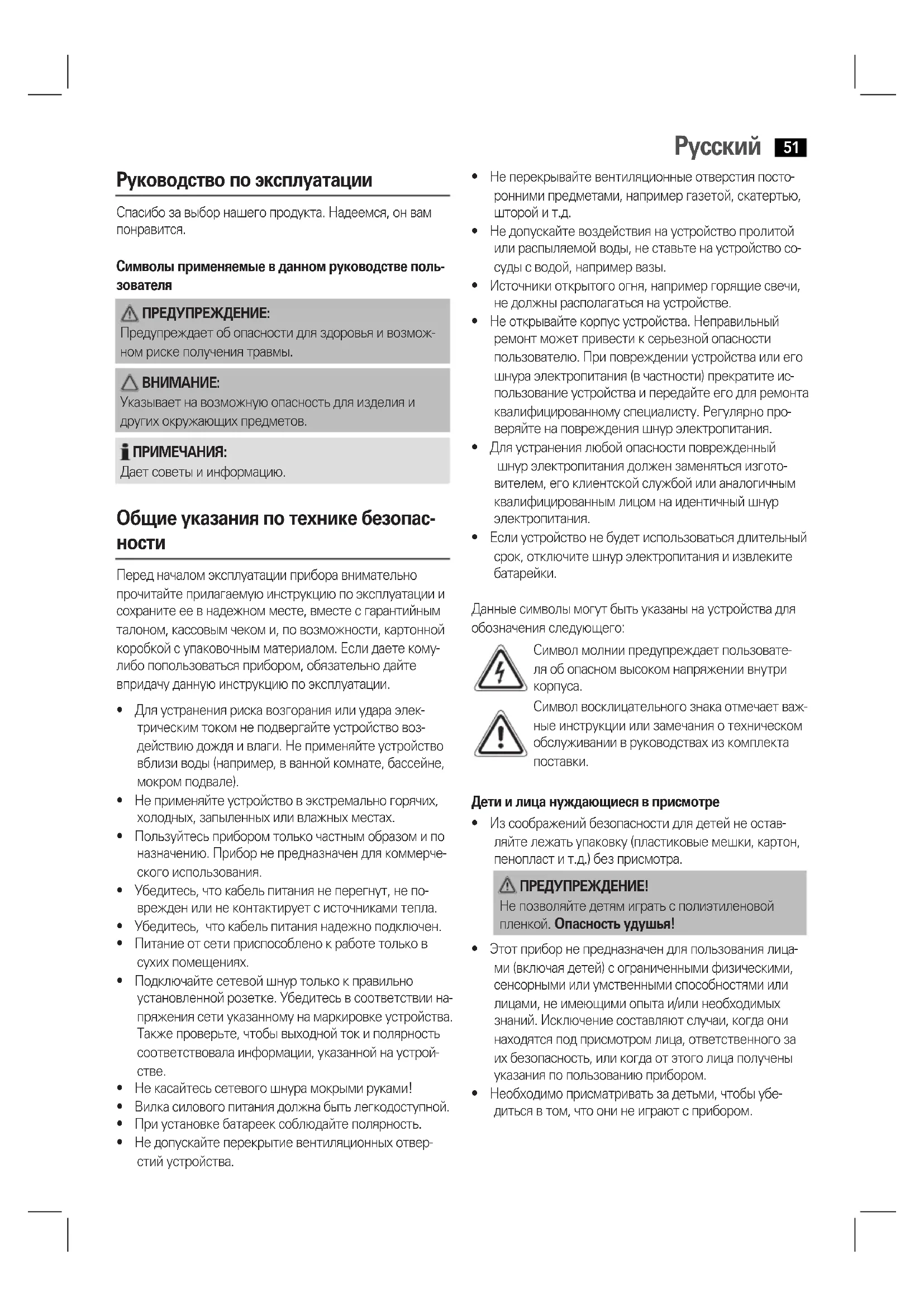 - Необходимоприсматриватьзадетьми,чтобыубе- диться в том, что они не играют с прибором.Русский