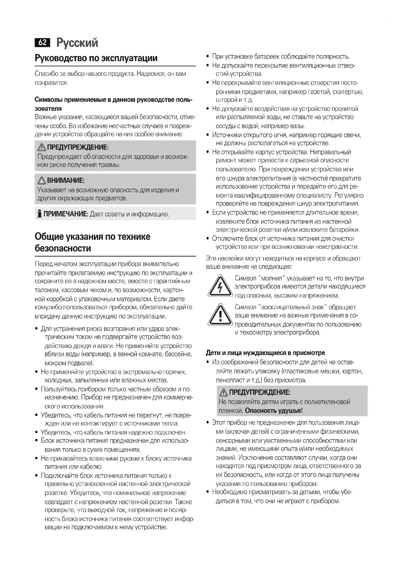 - Отключите блок от источника питания для очистки устройства или при возникновении неисправности. Эти наклейки могут находиться на корпусе и обращают ваше внимание на следующее: Символ ”молния“ указывает на то, что внутри электроприбора имеются детали находящиеся под опасным, высоким напряжением. Символ ”восклицательный знак“ обращает ваше внимание на важные примечания в со- проводительных документах по пользованию и техосмотру электроприбора. Дети и лица нуждающиеся в присмотре