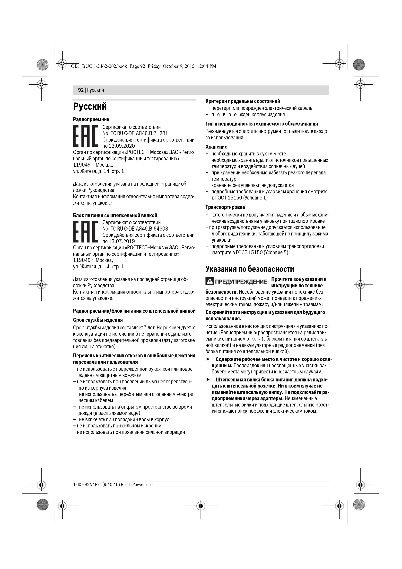 –подробные требования к условиям транспортировки смотрите в ГОСТ 15150 (Условие 5) Указания по безопасности Прочтите все указания и инструкции по технике безопасности. Несоблюдение указаний по технике без- опасности и инструкций может привести к поражению электрическим током, пожару и/или тяжелым травмам. Сохраняйте эти инструкции и указания для будущего использования. Использованное в настоящих инструкциях и указаниях по- нятие «Радиоприемник» распространяется на радиопри- емники с питанием от сети (с блоком питания со штепсель- ной вилкой) и на аккумуляторные радиоприемники (без блока питания со штепсельной вилкой). Содержите рабочее место в чистоте и хорошо осве- щенным. Беспорядок или неосвещенные участки ра- бочего места могут привести к несчастным случаям. Штепсельная вилка блока питания должна подхо- дить к штепсельной розетке. Ни в коем случае не изменяйте штепсельную вилку. Не подключайте ра- диоприемники через адаптеры. Неизмененные штепсельные вилки и подходящие штепсельные розет- ки снижают риск поражения электическим током. OBJ_BUCH-2462-002.book Page 92 Friday, October 9, 2015 12:04 PMРусский | 93 Bosch Power Tools 1 609 92A 1RZ | (9.10.15) Не разрешается использовать шнур блока питания не по назначению, например, для транспортировки или подвешивания радиоприемника, или для извле- чения вилки из штепсельной розетки. Защищайте шнур от воздействия высоких температур, масла, острых кромок или подвижных частей элек- троинструмента. Поврежденный или спутанный шнур повышает риск поражения электричеством. При эксплуатации радиоприемника от сети питания полностью раскручивайте шнур блока питания со штепсельной вилкой. Иначе шнур может нагреваться. Следите за тем, чтобы штепсель можно было в лю- бой момент извлечь из розетки. Отключение радио- приемника от сети возможно только при помощи штеп-