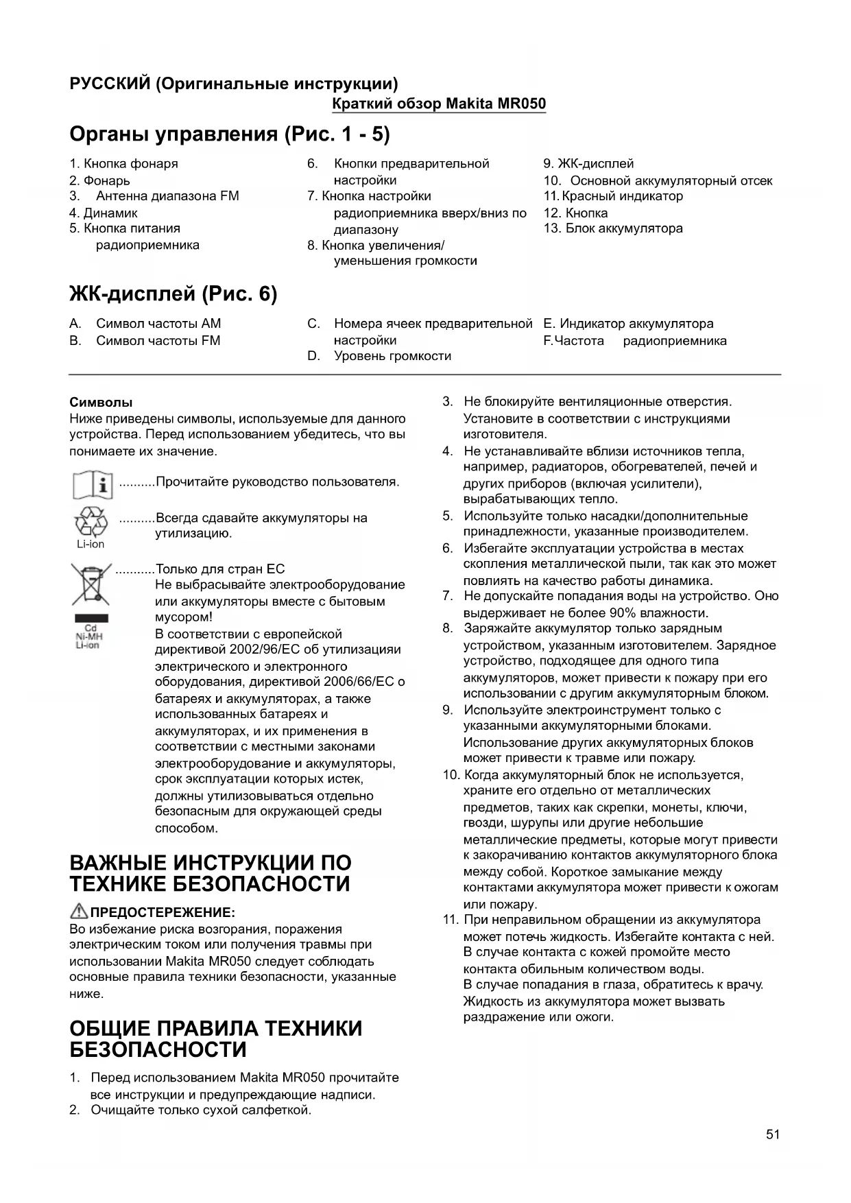 D. Уровень громкости E. Индикатор аккумулятора F. Частота радиоприемника Li-ion52 СПЕЦИФИЧЕСКИЕ ПРАВИЛА ТЕХНИКИ БЕЗОПАСНОСТИ СОХРАНИТЕ ДАННЫЕ ИНСТРУКЦИИ ДЛЯ АККУМУЛЯТОРНОГО БЛОКА