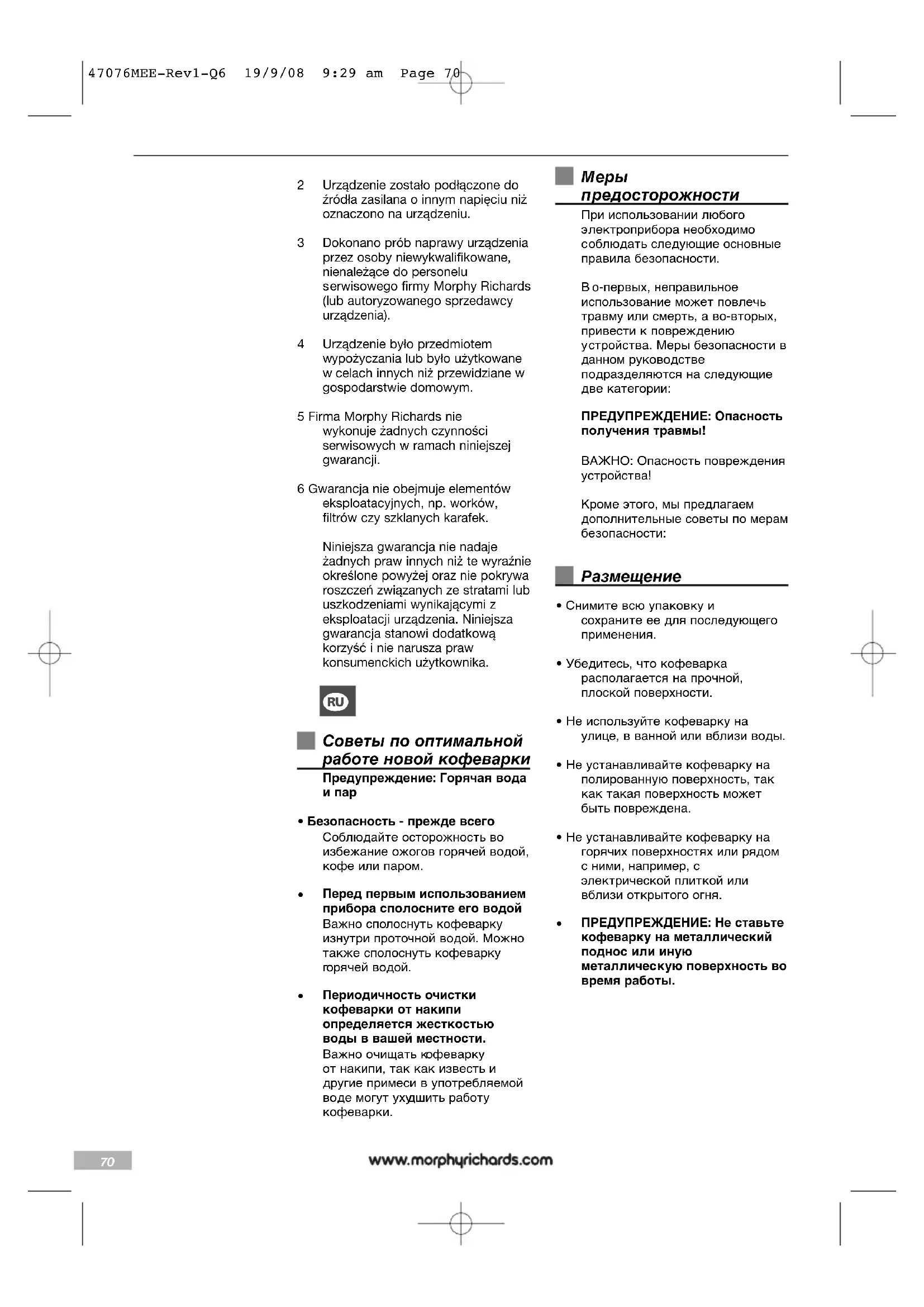 1. Гарантийное обслуживание продукцииMorphyRichardsосуществляется на всей территории России техническими