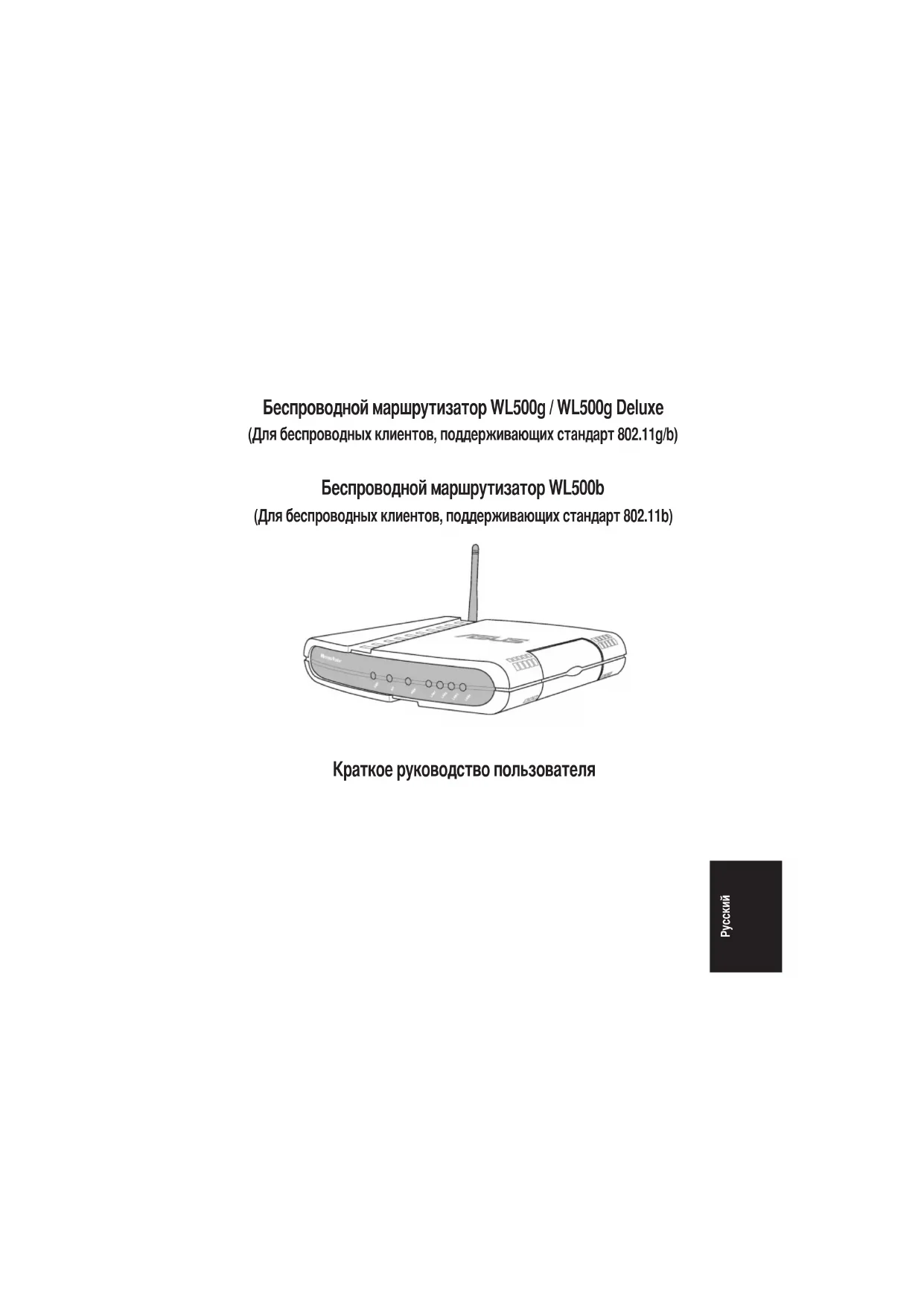 еспроводной маршрутизатор WL500g / WL500g Deluxe (ля беспроводных клиентов, поддерживающих стандарт 802.11g/b) еспроводной маршрутизатор WL500b (ля беспроводных клиентов, поддерживающих стандарт 802.11b) раткое руководство пользователяусский раткое руководство к беспроводному маршрутизатору ASUS