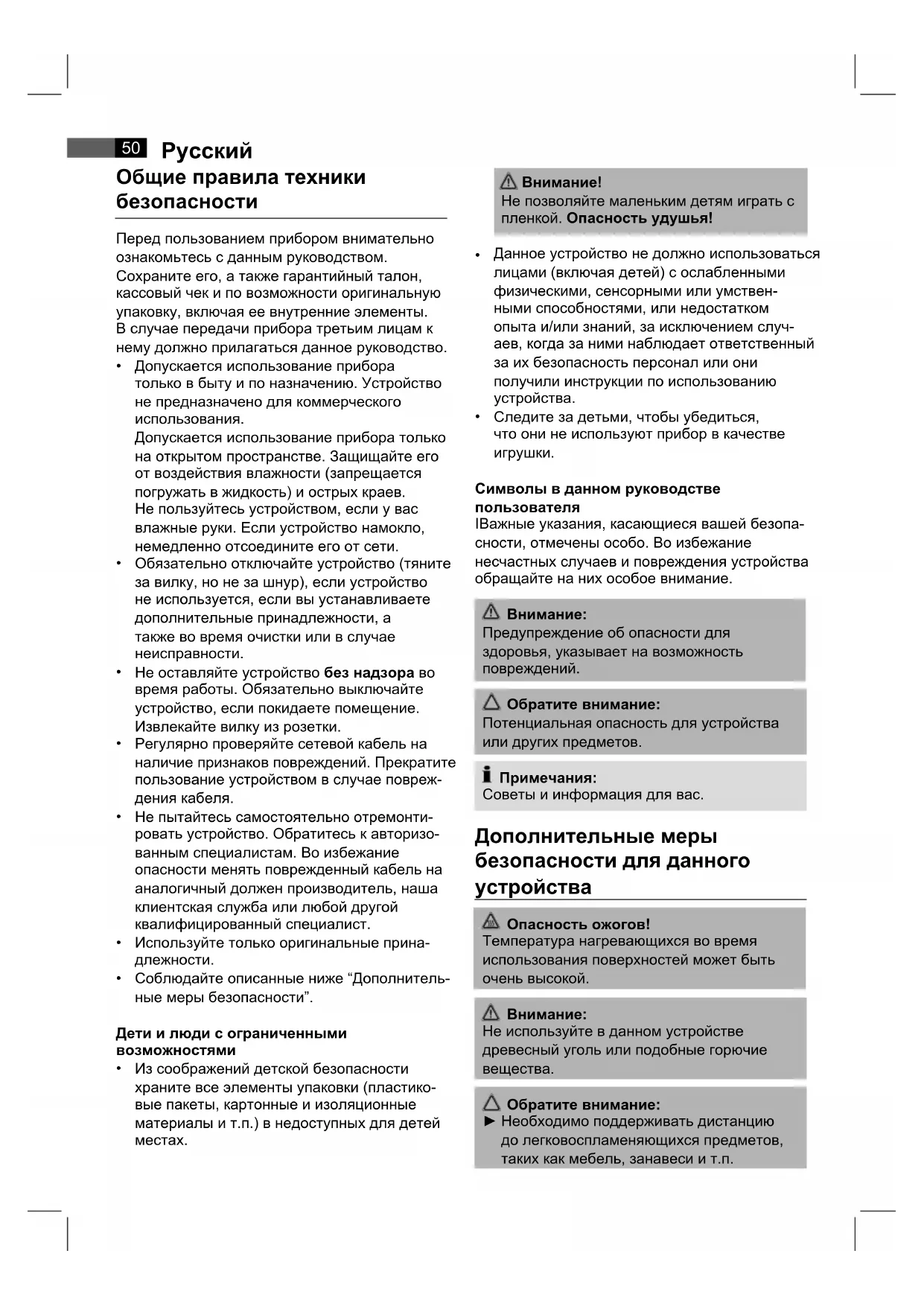 Не позволяйте маленьким детям играть с пленкой. Опасность удушья! Данное устройство не должно использоваться лицами (включая детей) с ослабленными физическими, сенсорными или умствен- ными способностями, или недостатком опыта и/или знаний, за исключением случ- аев, когда за ними наблюдает ответственный за их безопасность персонал или они получили инструкции по использованию устройства. Следите за детьми, чтобы убедиться, что они не используют прибор в качестве