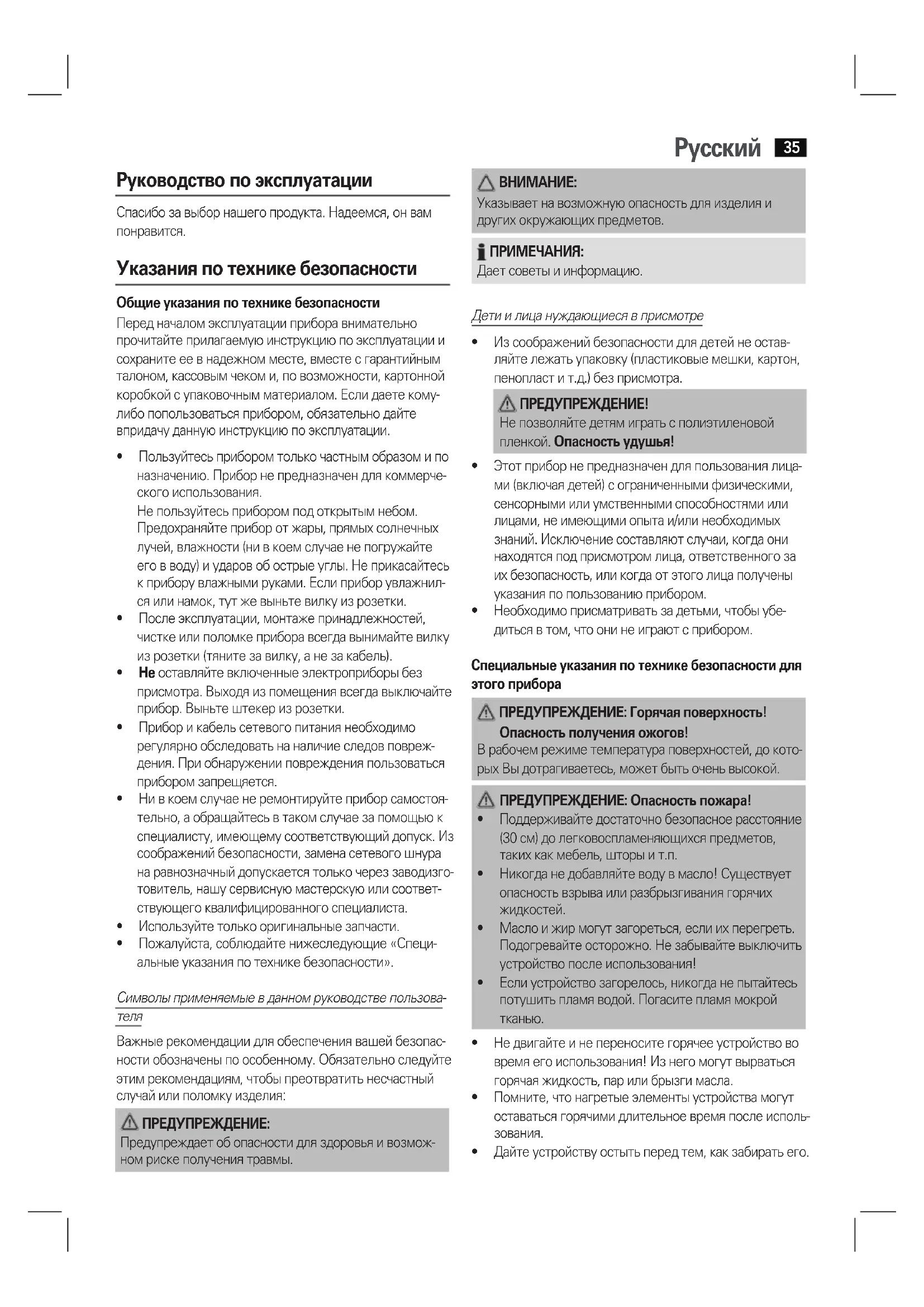 - Необходимоприсматриватьзадетьми,чтобыубе- диться в том, что они не играют с прибором. Специальные указания по технике безопасности для этого прибора ПРЕДУПРЕЖДЕНИЕ: Горячая поверхность! Опасность получения ожогов! Врабочемрежиметемператураповерхностей,докото- рыхВыдотрагиваетесь,можетбытьоченьвысокой. ПРЕДУПРЕЖДЕНИЕ: Опасность пожара!