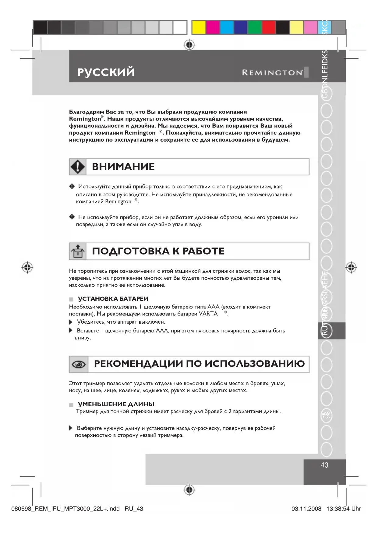 Убедитесь, что аппарат выключен. Вставьте 1 щелочную батарею AAA, при этом плюсовая полярность должна быть внизу. РЕКОМЕНДАЦИИ ПО ИСПОЛЬЗОВАНИЮ Этот триммер позволяет удалять отдельные волоски в любом месте: в бровях, ушах, носу, на шее, лице, коленях, лодыжках, руках и любых других местах. УМЕНЬШЕНИЕ ДЛИНЫТриммер для точной стрижки имеет расческу для бровей с 2 вариантами длины. Выберите нужную длину и установите насадку-расческу, повернув ее рабочей поверхностью в сторону лезвий триммера. 080698_REM_IFU_MPT3000_22L+.indd RU_43080698_REM_IFU_MPT3000_22L+.indd RU_43 03.11.2008 13:38:54 Uhr03.11.2008 13:38:54 Uhr44
