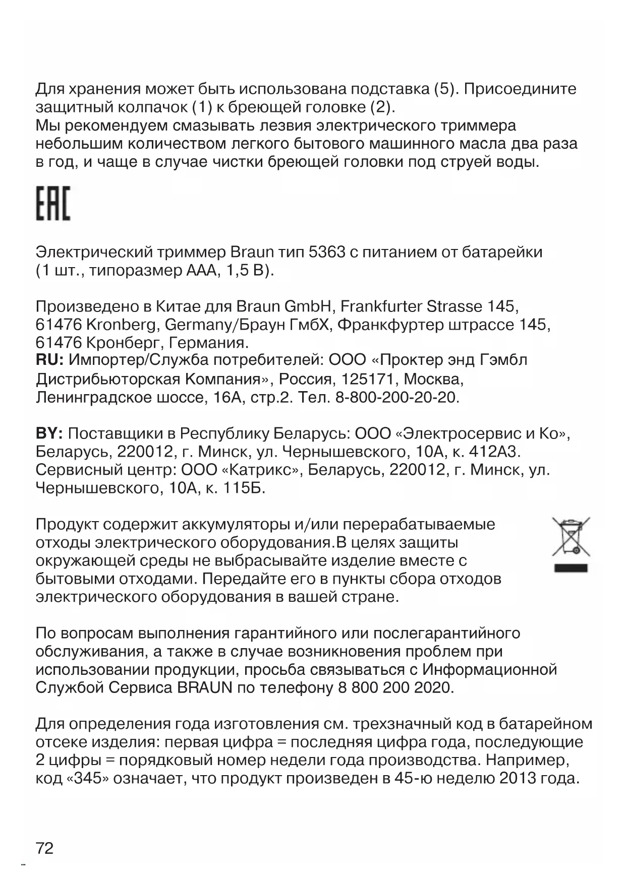 - ˚ Ӊ̇ ËÁ ÒÚÓÓÌ Ì‡Ò‡‰ÍË ÔË͇҇ÂÚÒfl Í ÍÓÊ ‚Ó ‚ÂÏfl ËÒÔÓθÁÓ‚‡ÌËfl ÔË·Ó‡. óËÒÚ͇ Ë ÛıÓ‰ è‰ ÔÓˆÂÒÒÓÏ ˜ËÒÚÍË ‚Ò„‰‡ ‚˚Íβ˜‡ÈÚ ÔË·Ó. ëÌËÏËÚ ·Â˛˘Û˛ „ÓÎÓ‚ÍÛ (2), ÔÓ‚ÂÌÛ‚  ÔÓÚË‚ ˜‡ÒÓ‚ÓÈ ÒÚÂÎÍË Ì‡ 90° Ë ÔËÔÓ‰Ìfl‚ (c). ÇÓÁÏÓÊ̇ ˜ËÒÚ͇ ÓÚÒÓ‰ËÌÂÌÌÓÈ ·Â˛˘ÂÈ „ÓÎÓ‚ÍË ÔÓ‰ ÒÚÛÂÈ ÚÂÔÎÓÈ ‚Ó‰˚. ì·Â‰ËÚÂÒ¸ ‚ ‡·ÒÓβÚÌÓÈ ÒÛıÓÒÚË ·Â˛˘ÂÈ „ÓÎÓ‚ÍË, Ô‰  ‡ÁÏ¢ÂÌËÂÏ Ì‡ ÔË·Ó. 91221272_PT_5010_EURO_S4-86.indd 7191221272_PT_5010_EURO_S4-86.indd 71 02.11.16 11:4602.11.16 11:46 CSS APPROVED Effective Date 4Nov2016 GMT - Printed 04Jan2017 Page 71 of 8672 Для хранения может быть использована подставка (5). Присоедините защитный колпачок (1) к бреющей головке (2). å˚ ÂÍÓÏẨÛÂÏ ÒχÁ˚‚‡Ú¸ ÎÂÁ‚Ëfl ˝ÎÂÍÚ˘ÂÒÍÓ„Ó ÚËÏχ Ì·Óθ¯ËÏ ÍÓ΢ÂÒÚ‚ÓÏ Î„ÍÓ„Ó ·˚ÚÓ‚Ó„Ó Ï‡¯ËÌÌÓ„Ó Ï‡Ò· ‰‚‡ ‡Á‡ ‚ „Ó‰, Ë ˜‡˘Â ‚ ÒÎÛ˜‡Â ˜ËÒÚÍË ·Â˛˘ÂÈ „ÓÎÓ‚ÍË ÔÓ‰ ÒÚÛÂÈ ‚Ó‰˚. Электрический триммер Braun тип 5363 с питанием от батарейки (1 шт., типоразмер ААА, 1,5 В). Произведено в Китае для Braun GmbH, Frankfurter Strasse 145, 61476 Kronberg, Germany/Браун ГмбХ, Франкфуртер штрассе 145, 61476 Кронберг, Германия. RU: àÏÔÓÚÂ/ëÎÛÊ·‡ ÔÓÚ·ËÚÂÎÂÈ: OOO «èÓÍÚ ˝Ì‰ É˝Ï·Î ÑËÒÚË·¸˛ÚÓÒ͇fl äÓÏÔ‡ÌËfl», êÓÒÒËfl, 125171, åÓÒÍ‚‡, ãÂÌËÌ„‡‰ÒÍÓ ¯ÓÒÒÂ, 16A, ÒÚ.2. íÂÎ. 8-800-200-20-20. BY: Поставщики в Республику Беларусь: ООО «Электросервис и Ко», Беларусь, 220012, г. Минск, ул. Чернышевского, 10А, к. 412А3. Сервисный центр: ООО «Катрикс», Беларусь, 220012, г. Минск, ул. Чернышевского, 10А, к. 115Б. Продукт содержит аккумуляторы и/или перерабатываемые отходы электрического оборудования.В целях защиты окружающей среды не выбрасывайте изделие вместе с бытовыми отходами. Передайте его в пункты сбора отходов электрического оборудования в вашей стране. èÓ ‚ÓÔÓÒ‡Ï ‚˚ÔÓÎÌÂÌËfl „‡‡ÌÚËÈÌÓ„Ó ËÎË ÔÓÒ΄‡‡ÌÚËÈÌÓ„Ó Ó·ÒÎÛÊË‚‡ÌËfl, ‡ Ú‡ÍÊ ‚ ÒÎÛ˜‡Â ‚ÓÁÌËÍÌÓ‚ÂÌËfl ÔÓ·ÎÂÏ ÔË ËÒÔÓθÁÓ‚‡ÌËË ÔÓ‰Û͈ËË, ÔÓÒ¸·‡ Ò‚flÁ˚‚‡Ú¸Òfl Ò àÌÙÓχˆËÓÌÌÓÈ ëÎÛÊ·ÓÈ ë‚ËÒ‡ BRAUN ÔÓ ÚÂÎÂÙÓÌÛ 8 800 200 2020. Для определения года изготовления см. трехзначный код в батарейном отсеке изделия: первая цифра = последняя цифра года, последующие 2 цифры = порядковый номер недели года производства. Например, код «345» означает, что продукт произведен в 45-ю неделю 2013 года. 91221272_PT_5010_EURO_S4-86.indd 7291221272_PT_5010_EURO_S4-86.indd 72 02.11.16 11:4602.11.16 11:46 CSS APPROVED Effective Date 4Nov2016 GMT - Printed 04Jan2017 Page 72 of 8673 ɇ‡ÌÚËÈÌ˚È ÒÓÍ/ëÓÍ ÒÎÛÊ·˚ 2 „Ó‰‡. Гарантийные обязательства Braun. На данное изделие распространяется гарантия в течение 2 лет с момента покупки. В течение гарантийного периода мы бесплатно устраним путем ремонта, замены деталей или замены всего изделия любые заводские дефекты, вызванные недостаточным качеством материала или сборки. В случае невозможности ремонта в гарантийный период, изделие может быть заменено на новое или аналогичное в соответствии с законом «О защите прав потребителей». Гарантия обретает силу только, если дата покупки подтверждается печатью и подписью дилера (магазина) на последней странице оригинальной инструкции по эксплуатации BRAUN, которая является гарантийным талоном. Данные гарантийные обязательства действуют во всех странах, где изделие распространяется самой фирмой Braun или назначенным дистрибьютором, и где никакие ограничения по импорту или другие правовые положения не препятствуют предоставлению гарантийного обслуживания. Гарантия не покрывает повреждения, вызванные неправильным использованием (см. также список ниже) и нормальный износ бритвенных сеток ножей, дефекты, оказывающие незначительный эффект на качество работы прибо