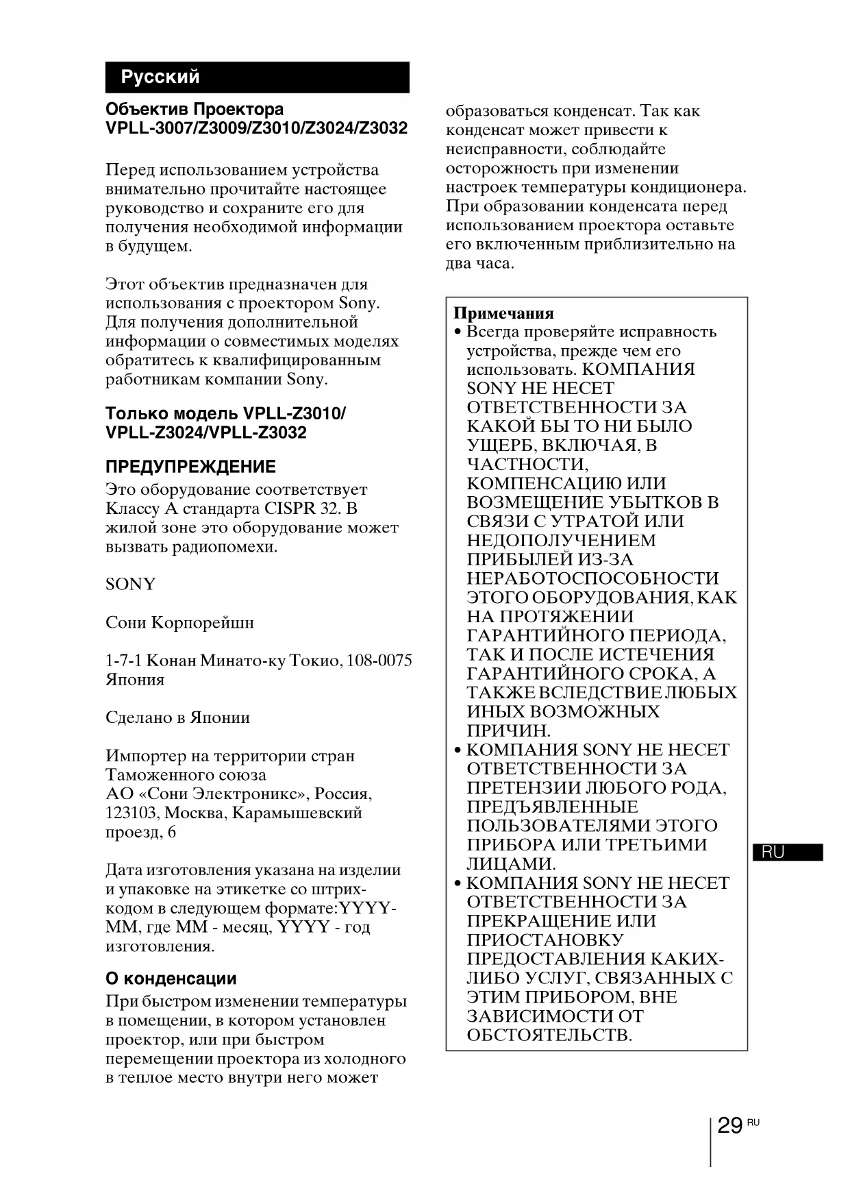 Этот объектив предназначен для использования с проектором Sony. Для получения дополнительной информации о совместимых моделях обратитесь к квалифицированным работникам компании Sony. Только модель VPLL-Z3010/ VPLL-Z3024/VPLL-Z3032 ПРЕДУПРЕЖДЕНИЕ Это оборудование соответствует Классу A стандарта CISPR 32. В жилой зоне это оборудование может вызвать радиопомехи. SONY Сони Корпорейшн 1-7-1 Конан Минато-ку Токио, 108-0075