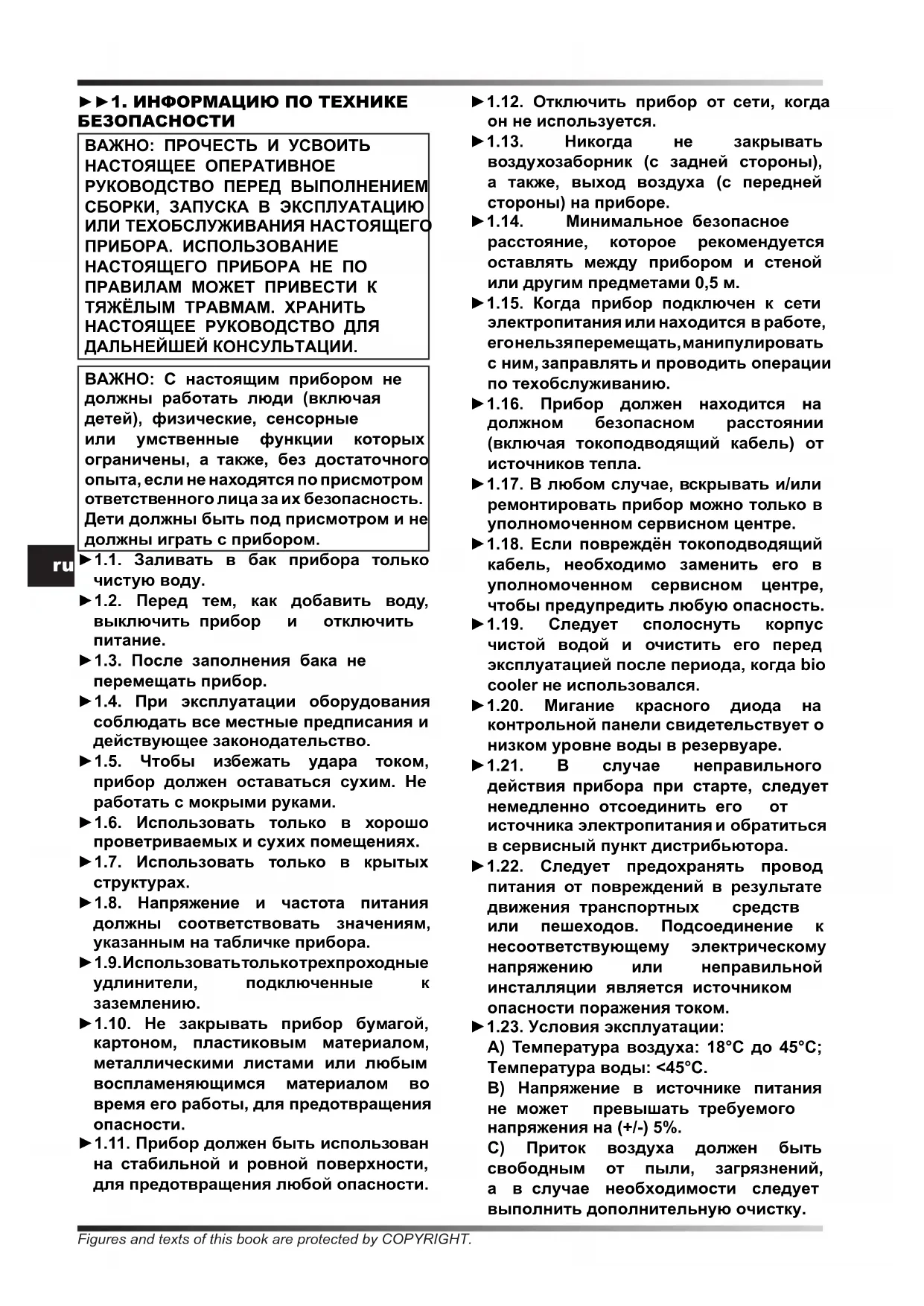 ►1.11. Прибор должен быть использован на стабильной и ровной поверхности, для предотвращения любой опасности. ►1.12. Отключить прибор от сети, когда он не используется. ►1.13. Никогда не закрывать воздухозаборник (с задней стороны), а также, выход воздуха (с передней стороны) на приборе. ►1.14. Минимальное безопасное расстояние, которое рекомендуется оставлять между прибором и стеной или другим предметами 0,5 м. ►1.15. Когда прибор подключен к сети электропитания или находится в работе, его нельзя перемещать, манипулировать с ним, заправлять и проводить операции по техобслуживанию. ►1.16. Прибор должен находится на должном безопасном расстоянии (включая токоподводящий кабель) от источников тепла. ►1.17. В любом случае, вскрывать и/или ремонтировать прибор можно только в уполномоченном сервисном центре. ►1.18. Если повреждён токоподводящий кабель, необходимо заменить его в уполномоченном сервисном центре, чтобы предупредить любую опасность. ►1.19. Следует сполоснуть корпус чистой водой и очистить его перед эксплуатацией после периода, когда bio cooler не использовался. ►1.20. Мигание красного диода на контрольной панели свидетельствует о низком уровне воды в резервуаре. ►1.21. В случае неправильного действия прибора при старте, следует немедленно отсоединить его от источника электропитания и обратиться в сервисный пункт дистрибьютора. ►1.22. Следует предохранять провод питания от повреждений в результате движения транспортных средств или пешеходов. Подсоединение к несоответствующему электрическому напряжению или неправильной инсталляции является источником опасности поражения током. ►1.23. Условия эксплуатации: A) Температура воздуха: 18°C до 45°C; Температура воды: <45°C. B) Напряжение в источнике питания не может превышать требуемого напряжения на (+/-) 5%. C) Приток воздуха должен быть свободным от пыли, загрязнений, а в случае необходимости следует выполнить дополнительную очистку. Figures and texts of this book are protected by COPYRIGHT.ru ►►2. СНЯТИЕ УПАКОВКИ ►2.1. Снять весь упаковочный материал, использованный для упаковки и отправления и утилизировать его согласно действующим нормативным требованиям. ►2.2. Изъять все компоненты из упаковки. ►2.3. Проверить, были ли нанесены повреждения во время перевозки. Если на приборе обнаружены повреждения, необходимо немедленно сообщить об этом представителю, у которого были приобретён прибор. ►►3. СБОРКА Прибор оснащён колёсами, что помогает его перемещать. В зависимости от модели, колёса могут быть установлены, или их необходимо установить. Необходимые компоненты и болтовой монтажный комплект к нему, находятся в упаковке (Илл. 1). ►►4. ФУНКЦИОНИРОВАНИЕ ПРЕДУПРЕЖДЕНИЕ: Внимательно прочесть ”ИНФОРМАЦИЮ ПО ТЕХНИКЕ БЕЗОПАСНОСТИ”, перед тем, как включить прибор. ПРЕДУПРЕЖДЕНИЕ: Использовать только чистую воду, чтобы предупредить поломки и неполадки. ПРЕДУПРЕЖДЕНИЕ: Проверить, что правильно выполнено заземление на вашей системе электропитания. Подключение к сети электропитания выполняется в соответствии с действующими национальными стандартами. Напряжение и частота питания должны соответствовать значениям, указанным на табличке