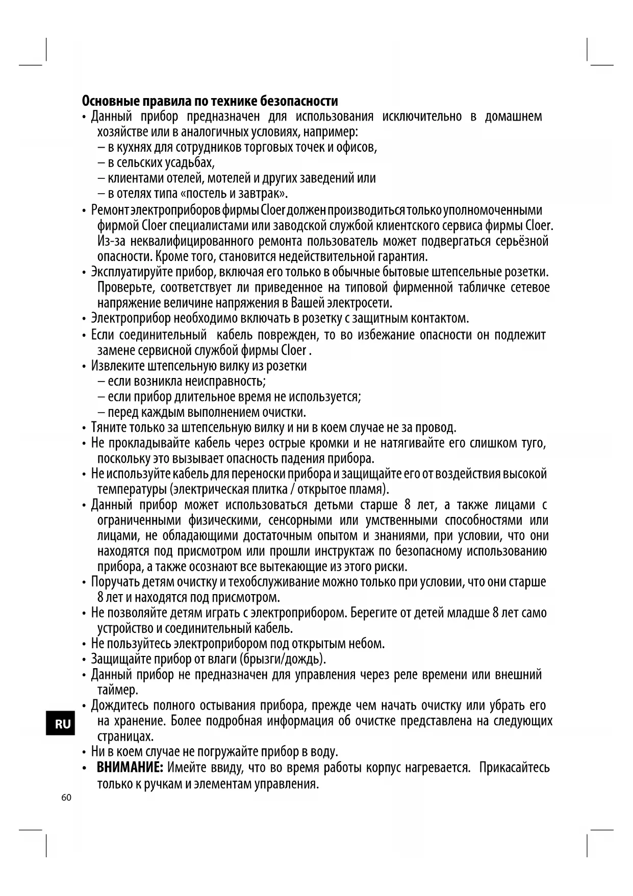 - Ремонт электроприборов фирмы Cloer должен производиться только уполномоченными фирмой Cloer специалистами или заводской службой клиентского сервиса фирмы Cloer. Из-за неквалифицированного ремонта пользователь может подвергаться серьёзной опасности. Кроме того, становится недействительной гарантия.