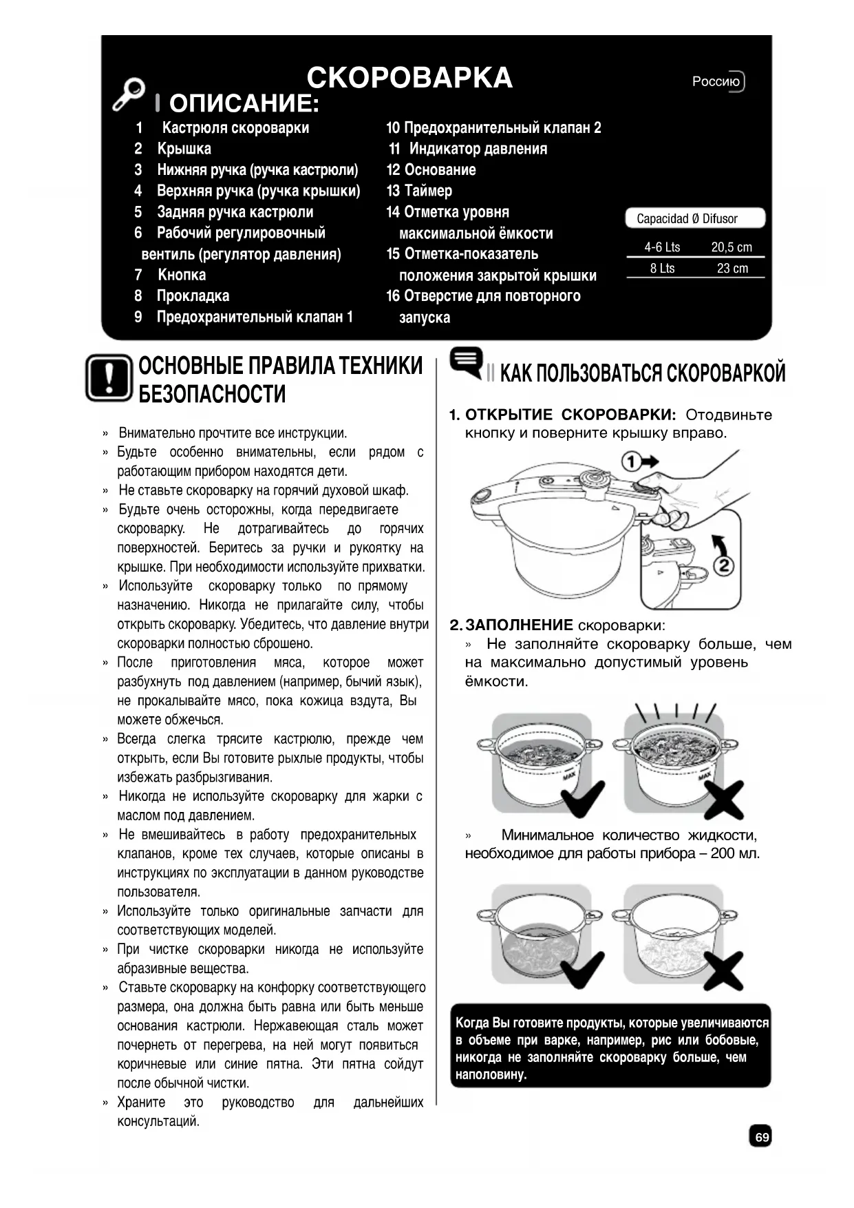 » Минимальное количество жидкости, необходимое для работы прибора – 200 мл. Когда Вы готовите продукты, которые увеличиваются в объеме при варке, например, рис или бобовые, никогда не заполняйте скороварку больше, чем наполовину. Capacidad Ø Difusor4-6 Lts8 Lts20,5 cm23 cm » Внимательно прочтите все инструкции. » Будьте особенно внимательны, если рядом с работающим прибором находятся дети. » Не ставьте скороварку на горячий духовой шкаф. » Будьте очень осторожны, когда передвигаете скороварку. Не дотрагивайтесь до горячих поверхностей. Беритесь за ручки и рукоятку на крышке. При необходимости используйте прихватки. » Используйте скороварку только по прямому назначению. Никогда не прилагайте силу, чтобы открыть скороварку. Убедитесь, что давление внутри скороварки полностью сброшено. » После приготовления мяса, которое может разбухнуть под давлением (например, бычий язык), не прокалывайте мясо, пока кожица вздута, Вы можете обжечься. » Всегда слегка трясите кастрюлю, прежде чем открыть, если Вы готовите рыхлые продукты, чтобы избежать разбрызгивания. » Никогда не используйте скороварку для жарки с маслом под давлением. » Не вмешивайтесь в работу предохранительных клапанов, кроме тех случаев, которые описаны в инструкциях по эксплуатации в данном руководстве пользователя. » Используйте только оригинальные запчасти для соответствующих моделей. » При чистке скороварки никогда не используйте абразивные вещества. » Ставьте скороварку на конфорку соответствующего размера, она должна быть равна или быть меньше основания кастрюли. Нержавеющая сталь может почернеть от перегрева, на ней могут появиться коричневые или синие пятна. Эти пятна сойдут после обычной чистки. » Храните это руководство для дальнейших консультаций. ОСНОВНЫЕ ПРАВИЛА ТЕХНИКИ БЕЗОПАСНОСТИ70