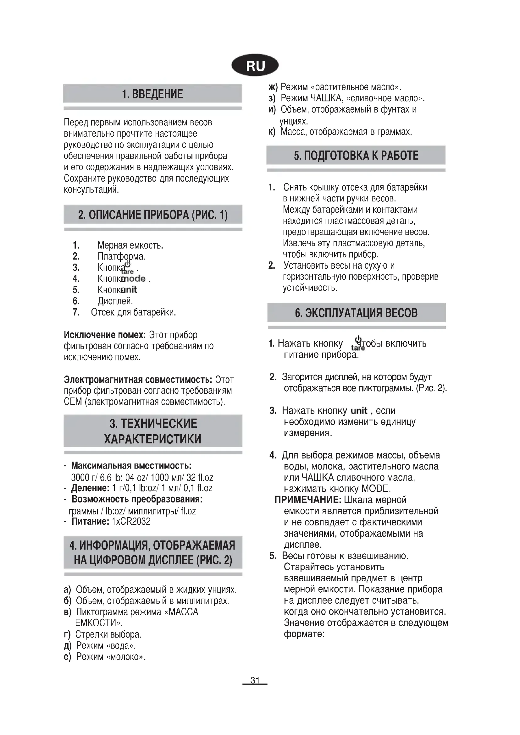 за да го поправяте. Това ще направи гаранцията невалидна.RU - Максимальная вместимость: 3000 г/ 6.6 lb: 04 oz/ 1000 мл/ 32 fl.oz - Деление: 1 г/0,1 lb:oz/ 1 мл/ 0,1 fl.oz - Возможность преобразования: граммы / lb:oz/ миллилитры/ fl.oz - Питание: 1xCR2032