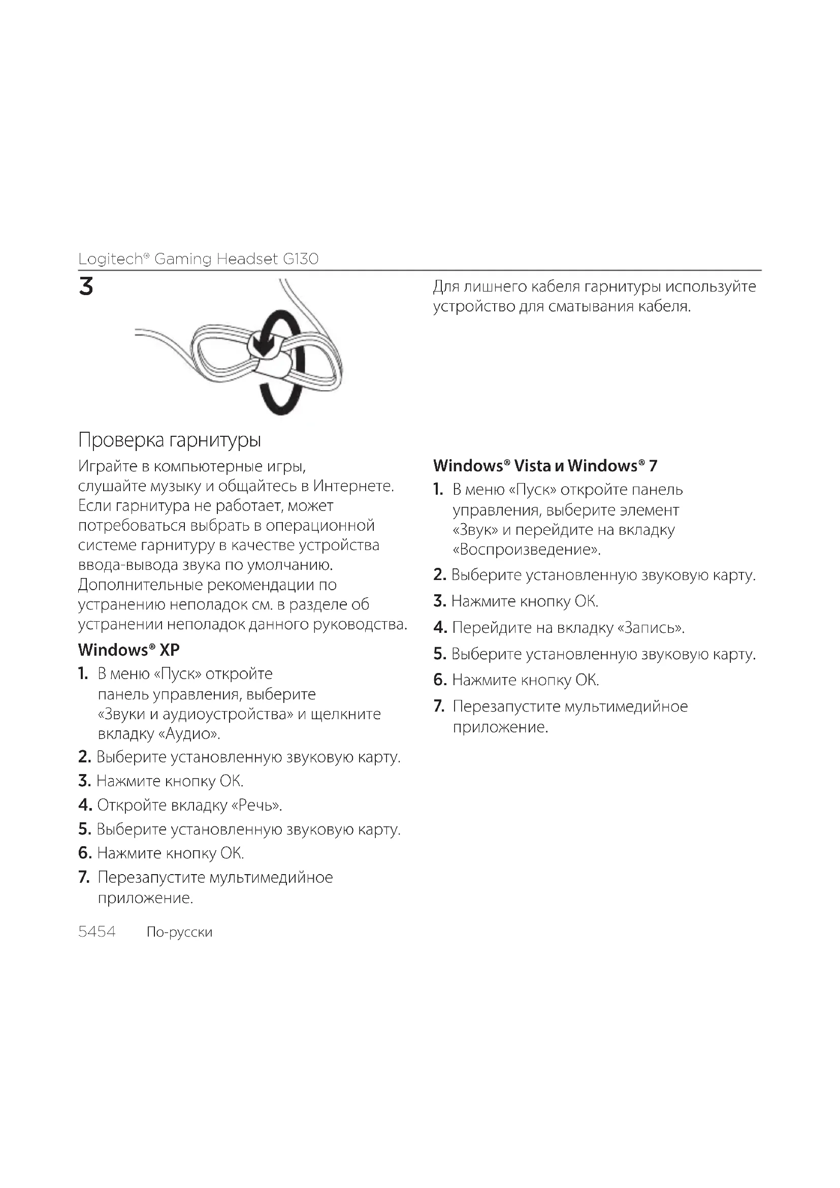Для лишнего кабеля гарнитуры используйте устройство для сматывания кабеля. Проверка гарнитуры Играйте в компьютерные игры, слушайте музыку и общайтесь в Интернете. Если гарнитура не работает, может потребоваться выбрать в операционной системе гарнитуру в качестве устройства ввода-вывода звука по умолчанию. Дополнительные рекомендации по устранению неполадок см. в разделе об устранении неполадок данного руководства. Windows® XP