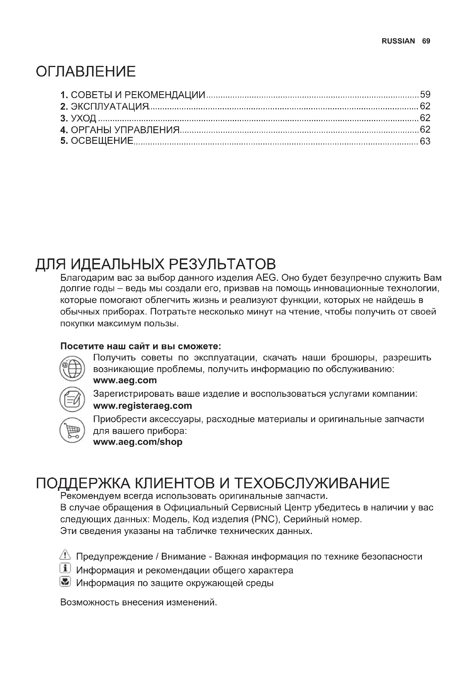 ДЛЯ ИДЕАЛЬНЫХ РЕЗУЛЬТАТОВ Благодарим вас за выбор данного изделия AEG. Оно будет безупречно служить Вам долгие годы – ведь мы создали его, призвав на помощь инновационные технологии, которые помогают облегчить жизнь и реализуют функции, которых не найдешь в обычных приборах. Потратьте несколько минут на чтение, чтобы получить от своей покупки максимум пользы. Посетите наш сайт и вы сможете: Получить советы по эксплуатации, скачать наши брошюры, разрешить возникающие проблемы, получить информацию по обслуживанию: www.aeg.com Зарегистрировать ваше изделие и воспользоваться услугами компании: www.registeraeg.com Приобрести аксессуары, расходные материалы и оригинальные запчасти для вашего прибора: www.aeg.com/shop ПОДДЕРЖКА КЛИЕНТОВ И ТЕХОБСЛУЖИВАНИЕ Рекомендуем всегда использовать оригинальные запчасти. В случае обращения в Официальный Сервисный Центр убедитесь в наличии у вас следующих данных: Модель, Код изделия (PNC), Серийный номер. Эти сведения указаны на табличке технических данных. Предупреждение / Внимание - Важная информация по технике безопасности Информация и рекомендации общего характера Информация по защите окружающей среды Возможность внесения изменений.70 www.aeg.com