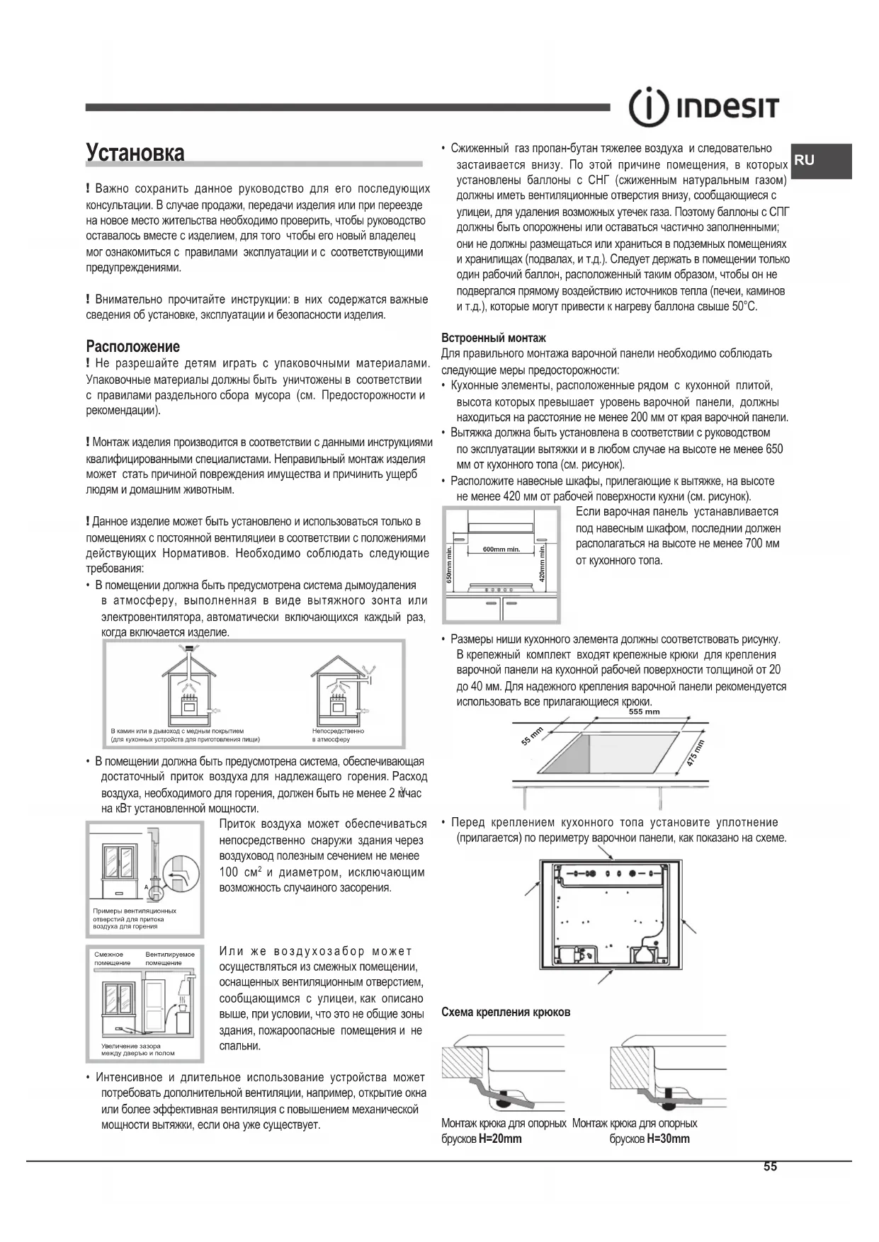 ! Важно сохранить данное руководство для его последующих консультации. В случае продажи, передачи изделия или при переезде на новое место жительства необходимо проверить, чтобы руководство оставалось вместе с изделием, для того чтобы его новый владелец мог ознакомиться с правилами эксплуатации и с соответствующими предупреждениями. ! Внимательно прочитайте инструкции: в них содержатся важные сведения об установке, эксплуатации и безопасности изделия. Расположение ! Не разрешайте детям играть с упаковочными материалами. Упаковочные материалы должны быть уничтожены в соответствии с правилами раздельного сбора мусора (см. Предосторожности и рекомендации). ! Монтаж изделия производится в соответствии с данными инструкциями квалифицированными специалистами. Неправильный монтаж изделия может стать причиной повреждения имущества и причинить ущерб людям и домашним животным. ! Данное изделие может быть установлено и использоваться только в помещениях с постоянной вентиляциеи в соответствии с положениями действующих Нормативов. Необходимо соблюдать следующие требования: