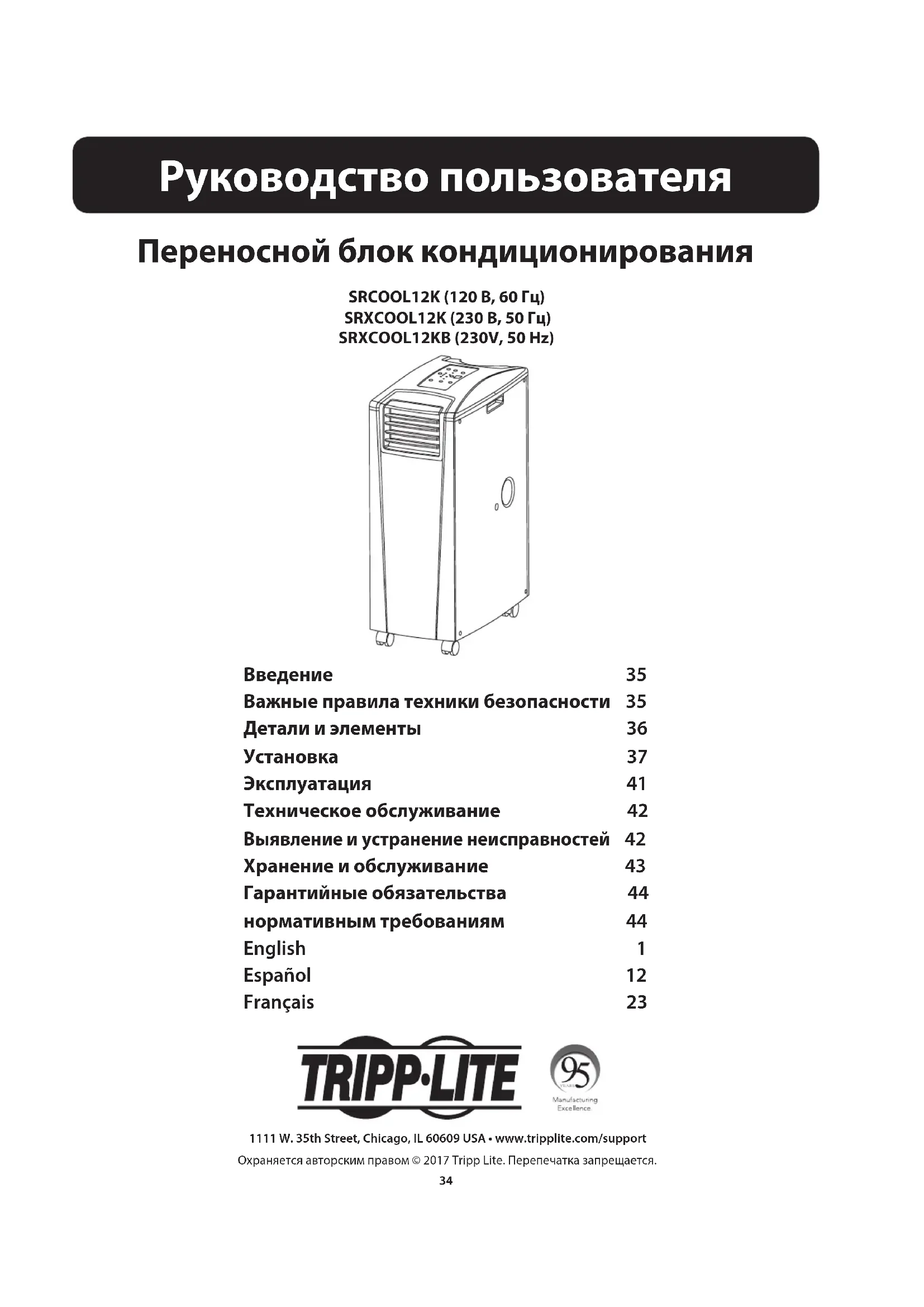 В случае исчезновения ошибки продолжайте эксплуатацию устройства в обычном порядке. В случае повторного возникновения ошибки обратитесь в компанию Tripp Lite за дальнейшими указаниями. Код dF Код dF отображается в тех случаях, когда устройство SR(X)COOL12K выявляет какое-либо условие, при котором змеевик работает при температуре ниже 1°C в течение более чем 15 минут. Во время события, отображаемого кодом dF, вентиляторы устройства вращаются без подключения компрессора во избежание замерзания испарителя. После подъема температуры змеевика выше 1°C компрессор возобновляет свою обычную работу. При сохранении указанного условия устройство функционирует в слишком холодной среде. При температурах эксплуатации ниже 20°C компания Tripp Lite рекомендует использовать устройство только в режиме осушения. Более подробную информацию см. в пункте Эксплуатация при низких температурах раздела 6-3.44 1111 W. 35th Street, Chicago, IL 60609 USA • www.tripplite.com/support 17-05-256 93-33FA_RevD Гарантийные обязательства 1ОГРАНИЧЕННАЯ ГАРАНТИЯ 1 год Продавец гарантирует отсутствие изначальных дефектов материала или изготовления в течение 1 года с момента первой покупки данного изделия при условии его использования в соответствии со всеми применимыми к нему указаниями. В случае проявления каких-либо дефектов материала или изготовления в течение указанного периода Продавец осуществляет ремонт или замену данного изделия исключительно по своему усмотрению. Обслуживание по настоящей Гарантии производится только при условии доставки или отправки вами бракованного изделия (с предварительной оплатой всех расходов по его транспортировке или доставке) по адресу: Tripp Lite, 1111 W. 35th Street, Chicago, IL 60609 USA. Расходы по обратной транспортировке изделия оплачиваются Продавцом. ДЕЙСТВИЕ НАСТОЯЩЕЙ ГАРАНТИИ НЕ РАСПРОСТРАНЯЕТСЯ НА СЛУЧАИ ЕСТЕСТВЕННОГО ИЗНОСА ИЛИ ПОВРЕЖДЕНИЯ В РЕЗУЛЬТАТЕ АВАРИИ, НЕНАДЛЕЖАЩЕГО ИСПОЛЬЗОВАНИЯ, НАРУШЕНИЯ ПРАВИЛ ЭКСПЛУАТАЦИИ ИЛИ ХАЛАТНОСТИ. ПРОДАВЕЦ НЕ ПРЕДОСТАВЛЯЕТ НИКАКИХ ЯВНО ВЫРАЖЕННЫХ ГАРАНТИЙ ЗА ИСКЛЮЧЕНИЕМ ПРЯМО ИЗЛОЖЕННОЙ В НАСТОЯЩЕМ ДОКУМЕНТЕ. ЗА ИСКЛЮЧЕНИЕМ СЛУЧАЕВ, ЗАПРЕЩЕННЫХ ДЕЙСТВУЮЩИМ ЗАКОНОДАТЕЛЬСТВОМ, ВСЕ ПОДРАЗУМЕВАЕМЫЕ ГАРАНТИИ, ВКЛЮЧАЯ ВСЕ ГАРАНТИИ ПРИГОДНОСТИ ДЛЯ ПРОДАЖИ ИЛИ ИСПОЛЬЗОВАНИЯ ПО НАЗНАЧЕНИЮ, ОГРАНИЧЕНЫ ПО ПРОДОЛЖИТЕЛЬНОСТИ ДЕЙСТВИЯ ВЫШЕУКАЗАННЫМ ГАРАНТИЙНЫМ СРОКОМ; КРОМЕ ТОГО, ИЗ НАСТОЯЩЕЙ ГАРАНТИИ ЯВНЫМ ОБРАЗОМ ИСКЛЮЧАЮТСЯ ВСЕ ПОБОЧНЫЕ, СЛУЧАЙНЫЕ И КОСВЕННЫЕ УБЫТКИ. (В некоторых штатах не допускается введение ограничений на продолжительность действия тех или иных подразумеваемых гарантий, а в некоторых - исключение или ограничение размера побочных или косвенных убытков. В этих случаях вышеизложенные ограничения или исключения могут на вас не распространяться. Настоящая Гарантия предоставляет вам конкретные юридические права, а набор других ваших прав может быть различным в зависимости от юрисдикции). ВНИМАНИЕ: Перед началом использования данного устройства пользователь должен убедиться в том, что оно является пригодным, соответствующим или безопасным для предполагаемого применения. В связи с большим разнообразием конкретных применений производитель не дает каких-либо заверений или гарантий относительно пригодности данного изделия для какого-либо конкретного применения или его соответствия каким-либо конкретным требованиям.. Г