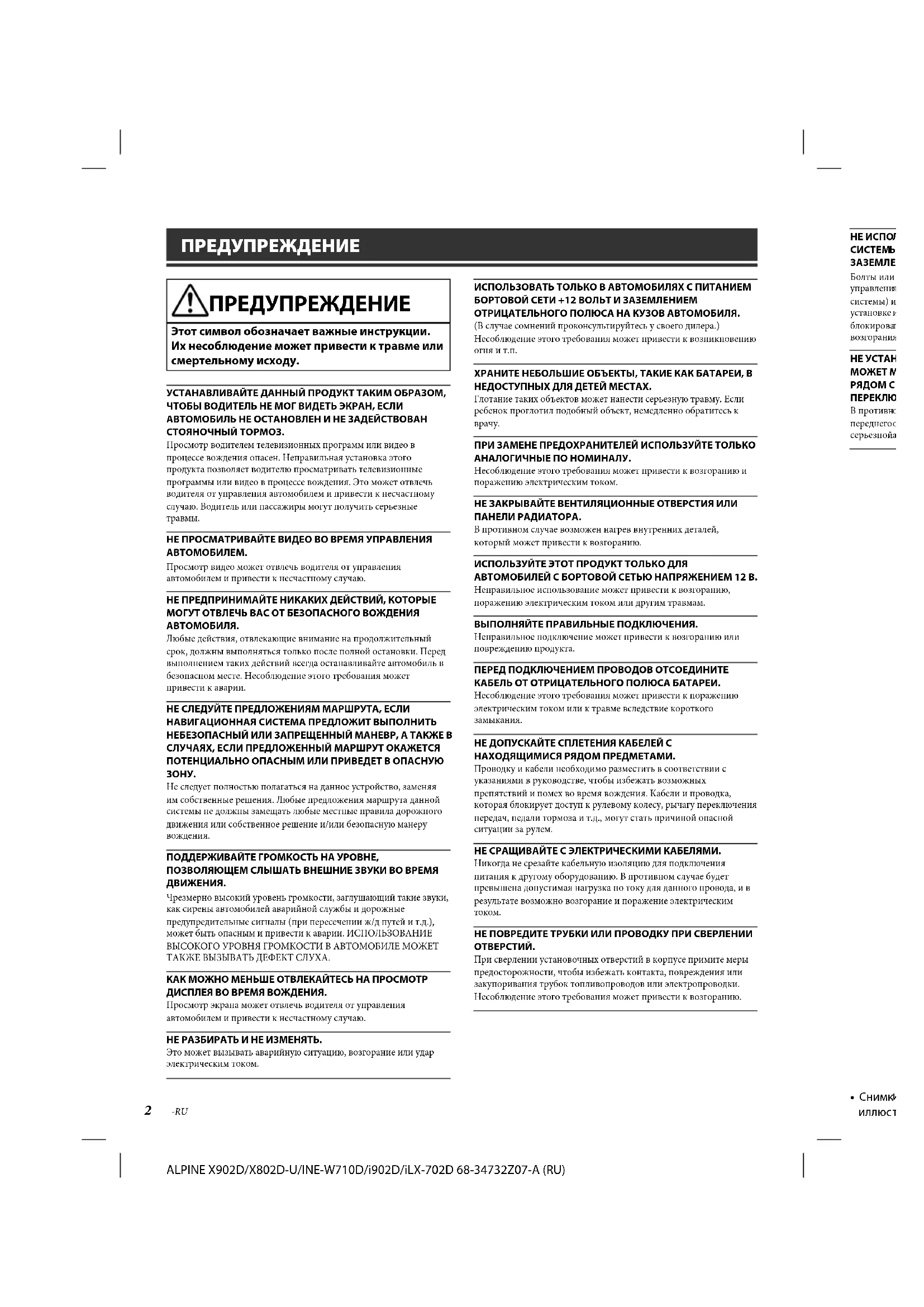 - Технические характеристики ALPINE X902D/X802D-U/INE-W710D/i902D/iLX-702D 68-34732Z07-A (RU) 2-RU ПРЕДУПРЕЖДЕНИЕ ПРЕДУПРЕЖДЕНИЕ Этот символ обозначает важные инструкции. Их несоблюдение может привести к травме или смертельному исходу. УСТАНАВЛИВАЙТЕ ДАННЫЙ ПРОДУКТ ТАКИМ ОБРАЗОМ, ЧТОБЫ ВОДИТЕЛЬ НЕ МОГ ВИДЕТЬ ЭКРАН, ЕСЛИ АВТОМОБИЛЬ НЕ ОСТАНОВЛЕН И НЕ ЗАДЕЙСТВОВАН СТОЯНОЧНЫЙ ТОРМОЗ.Просмотр водителем телевизионных программ или видео в процессе вождения опасен. Неправильная установка этого продукта позволяет водителю просматривать телевизионные программы или видео в процессе вождения. Это может отвлечь водителя от управления автомобилем и привести к несчастному случаю. Водитель или пассажиры могут получить серьезные травмы.НЕ ПРОСМАТРИВАЙТЕ ВИДЕО ВО ВРЕМЯ УПРАВЛЕНИЯ АВТОМОБИЛЕМ.Просмотр видео может отвлечь водителя от управления автомобилем и привести к несчастному случаю.НЕ ПРЕДПРИНИМАЙТЕ НИКАКИХ ДЕЙСТВИЙ, КОТОРЫЕ МОГУТ ОТВЛЕЧЬ ВАС ОТ БЕЗОПАСНОГО ВОЖДЕНИЯ АВТОМОБИЛЯ.Любые действия, отвлекающие внимание на продолжительный срок, должны выполняться только после полной остановки. Перед выполнением таких действий всегда останавливайте автомобиль в безопасном месте. Несоблюдение этого требования может привести к аварии.НЕ СЛЕДУЙТЕ ПРЕДЛОЖЕНИЯМ МАРШРУТА, ЕСЛИ НАВИГАЦИОННАЯ СИСТЕМА ПРЕДЛОЖИТ ВЫПОЛНИТЬ НЕБЕЗОПАСНЫЙ ИЛИ ЗАПРЕЩЕННЫЙ МАНЕВР, А ТАКЖЕ В СЛУЧАЯХ, ЕСЛИ ПРЕДЛОЖЕННЫЙ МАРШРУТ ОКАЖЕТСЯ ПОТЕНЦИАЛЬНО ОПАСНЫМ ИЛИ ПРИВЕДЕТ В ОПАСНУЮ ЗОНУ.Не следует полностью полагаться на данное устройство, заменяя им собственные решения. Любые предложения маршрута данной системы не должны замещать любые местные правила дорожного движения или собственное решение и/или безопасную манеру вождения.ПОДДЕРЖИВАЙТЕ ГРОМКОСТЬ НА УРОВНЕ, ПОЗВОЛЯЮЩЕМ СЛЫШАТЬ ВНЕШНИЕ ЗВУКИ ВО ВРЕМЯ ДВИЖЕНИЯ.Чрезмерно высокий уровень громкости, заглушающий такие звуки, как сирены автомобилей аварийной службы и дорожные предупредительные сигналы (при пересечении ж/д путей и т.д.), может быть опасным и привести к аварии. ИСПОЛЬЗОВАНИЕ ВЫСОКОГО УРОВНЯ ГРОМКОСТИ В АВТОМОБИЛЕ МОЖЕТ ТАКЖЕ ВЫЗЫВАТЬ ДЕФЕКТ СЛУХА.КАК МОЖНО МЕНЬШЕ ОТВЛЕКАЙТЕСЬ НА ПРОСМОТР ДИСПЛЕЯ ВО ВРЕМЯ ВОЖДЕНИЯ.Просмотр экрана может отвлечь водителя от управления автомобилем и привести к несчастному случаю.НЕ РАЗБИРАТЬ И НЕ ИЗМЕНЯТЬ.Это может вызывать аварийную ситуацию, возгорание или удар электрическим током.ИСПОЛЬЗОВАТЬ ТОЛЬКО В АВТОМОБИЛЯХ С ПИТАНИЕМ БОРТОВОЙ СЕТИ +12 ВОЛЬТ И ЗАЗЕМЛЕНИЕМ ОТРИЦАТЕЛЬНОГО ПОЛЮСА НА КУЗОВ АВТОМОБИЛЯ.(В случае сомнений проконсультируйтесь у своего дилера.) Несоблюдение этого требования может привести к возникновению огня и т.п.ХРАНИТЕ НЕБОЛЬШИЕ ОБЪЕКТЫ, ТАКИЕ КАК БАТАРЕИ, В НЕДОСТУПНЫХ ДЛЯ ДЕТЕЙ МЕСТАХ.Глотание таких объектов может нанести серьезную травму. Если ребенок проглотил подобный объект, немедленно обратитесь к врачу.ПРИ ЗАМЕНЕ ПРЕДОХРАНИТЕЛЕЙ ИСПОЛЬЗУЙТЕ ТОЛЬКО АНАЛОГИЧНЫЕ ПО НОМИНАЛУ.Несоблюдение этого требования может привести к возгоранию и поражению электрическим током.НЕ ЗАКРЫВАЙТЕ ВЕНТИЛЯЦИОННЫЕ ОТВЕРСТИЯ ИЛИ ПАНЕЛИ РАДИАТОРА.В противном случае возможен нагрев внутренних деталей, который может привести к возгоранию.ИСПОЛЬЗУЙТЕ ЭТОТ ПРОДУКТ ТОЛЬКО ДЛЯ АВТОМОБИЛЕЙ С БОРТОВОЙ СЕТЬЮ НАПРЯЖЕНИЕМ 12 В.Неправильное использование может привести к возгорани