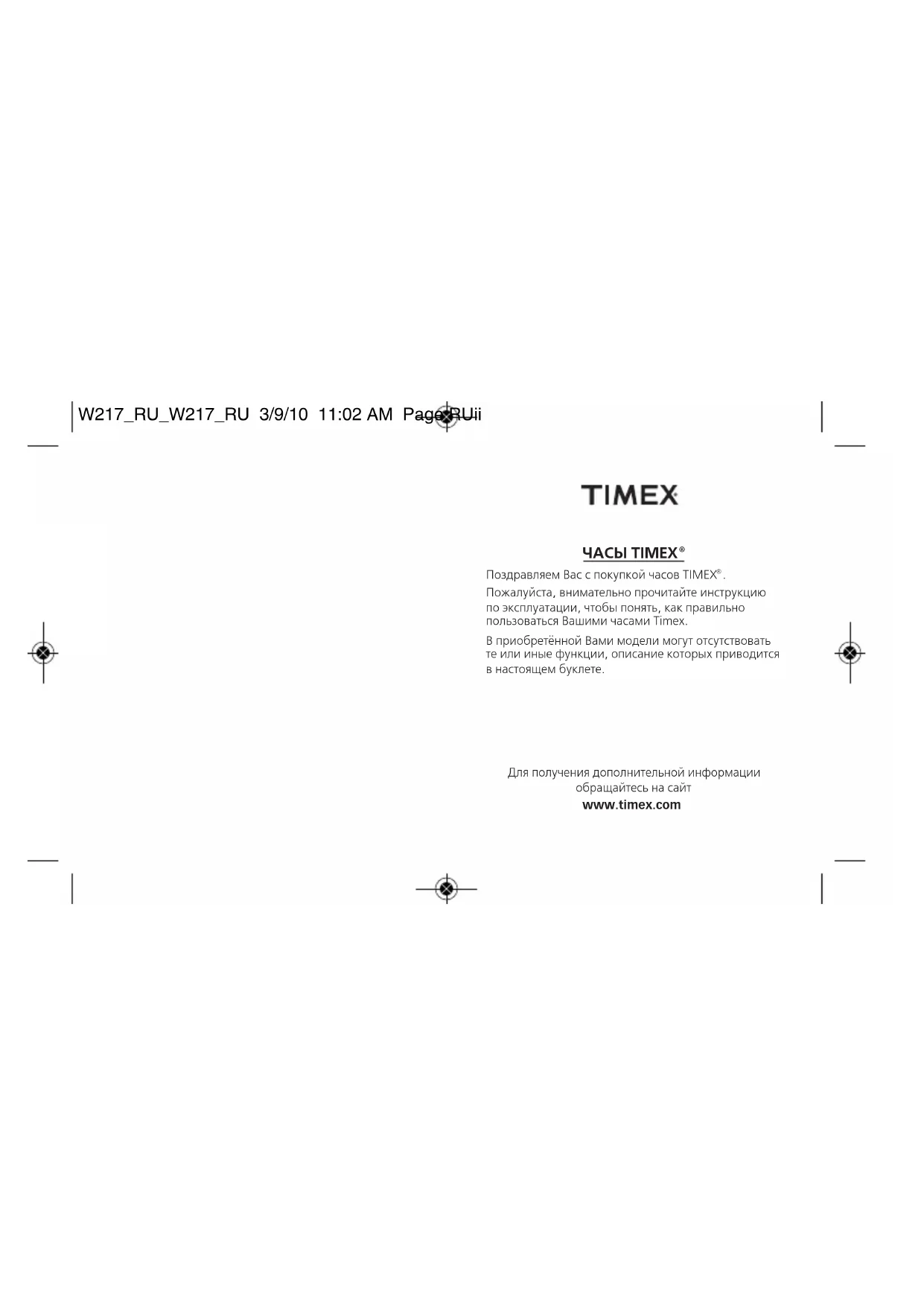 Пожалуйста, внимательно прочитайте инструкцию по эксплуатации, чтобы понять, как правильно пользоваться Вашими часами Timex. В приобретённой Вами модели могут отсутствовать те или иные функции, описание которых приводится в настоящем буклете. Для получения дополнительной информации обращайтесь на сайт www.timex.com W217_RU_W217_RU 3/9/10 11:02 AM Page RUiiОГЛАВЛЕНИЕ 80 С чего начать настройку часов 81 Водонепроницаемость и ударопрочность 82 Ночная подсветка Indiglo
